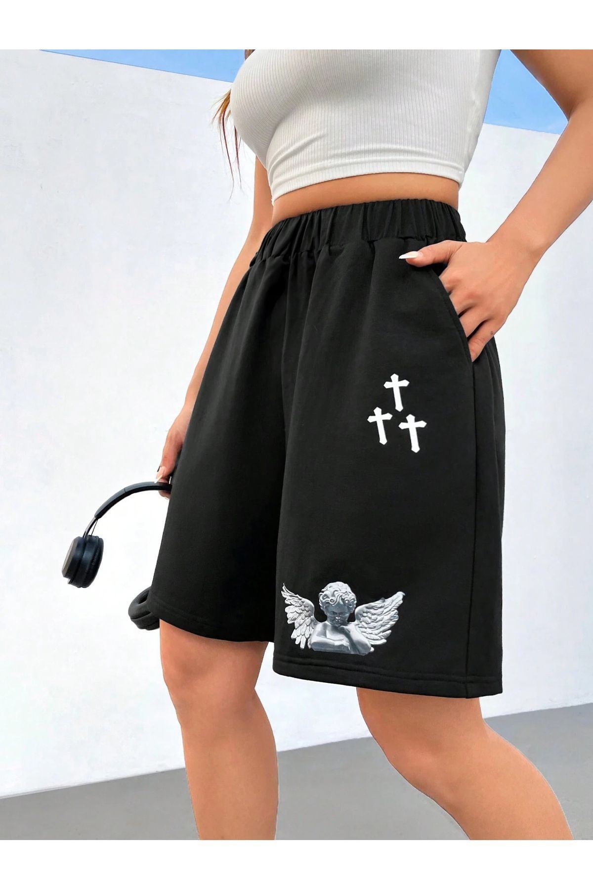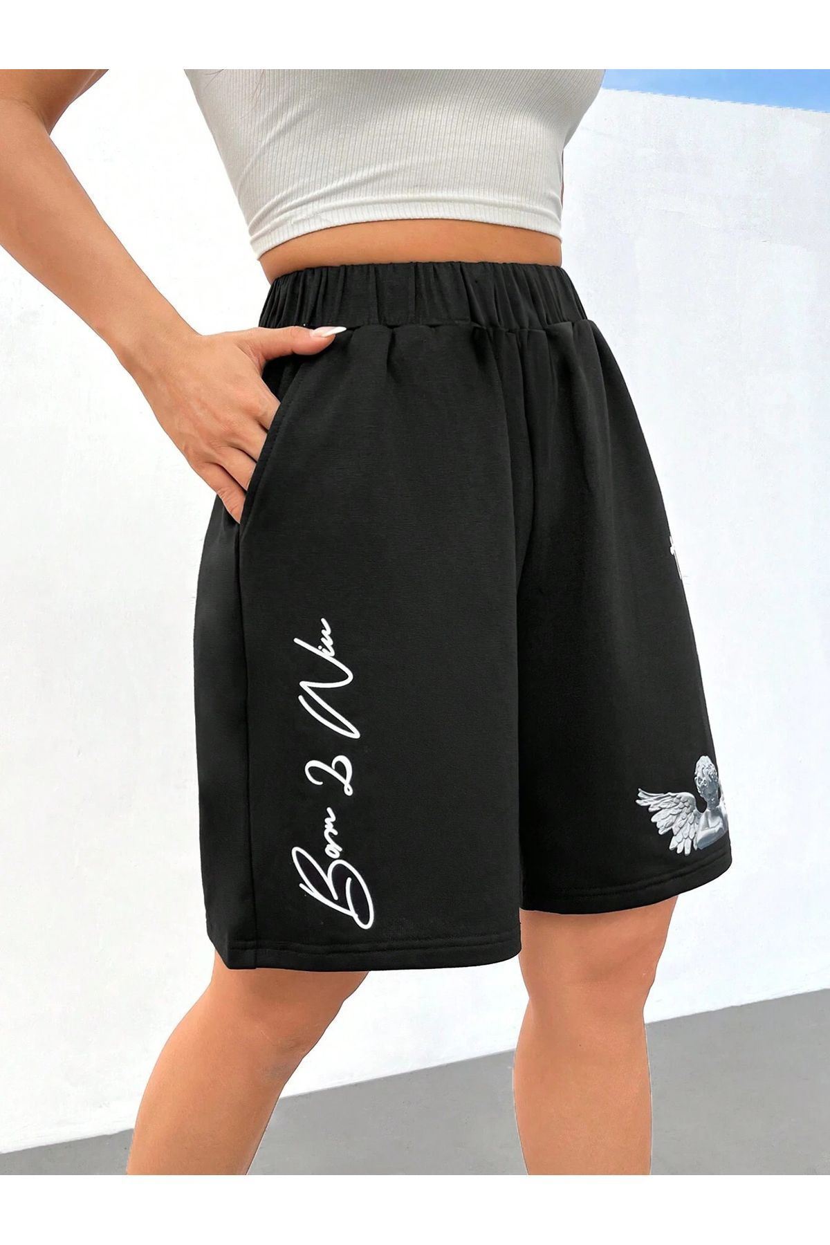 Melek tasarımıyla öne çıkan siyah baskılı penye şort, genç ve dinamik bir stil sunar.; Örme kumaşı sayesinde esnek ve konforlu bir yapıya sahip olup hareket özgürlüğünüzü kısıtlamaz.; Mini boyu ile bacaklarınızı sergilerken aynı zamanda rahatlık sağlar.; Yüksek bel tasarımı sayesinde vücut hatlarınıza mükemmel uyum sağlayarak şık bir siluet oluşturur.; Tüm yaş gruplarına uygun olarak tasarlanmıştır, herkes tarafından keyifle kullanılabilir.; Kordonsuz yapısıyla modern ve minimalist bir görünüm kazandırır, günlük kombinlerin vazgeçilmezi olur.;
