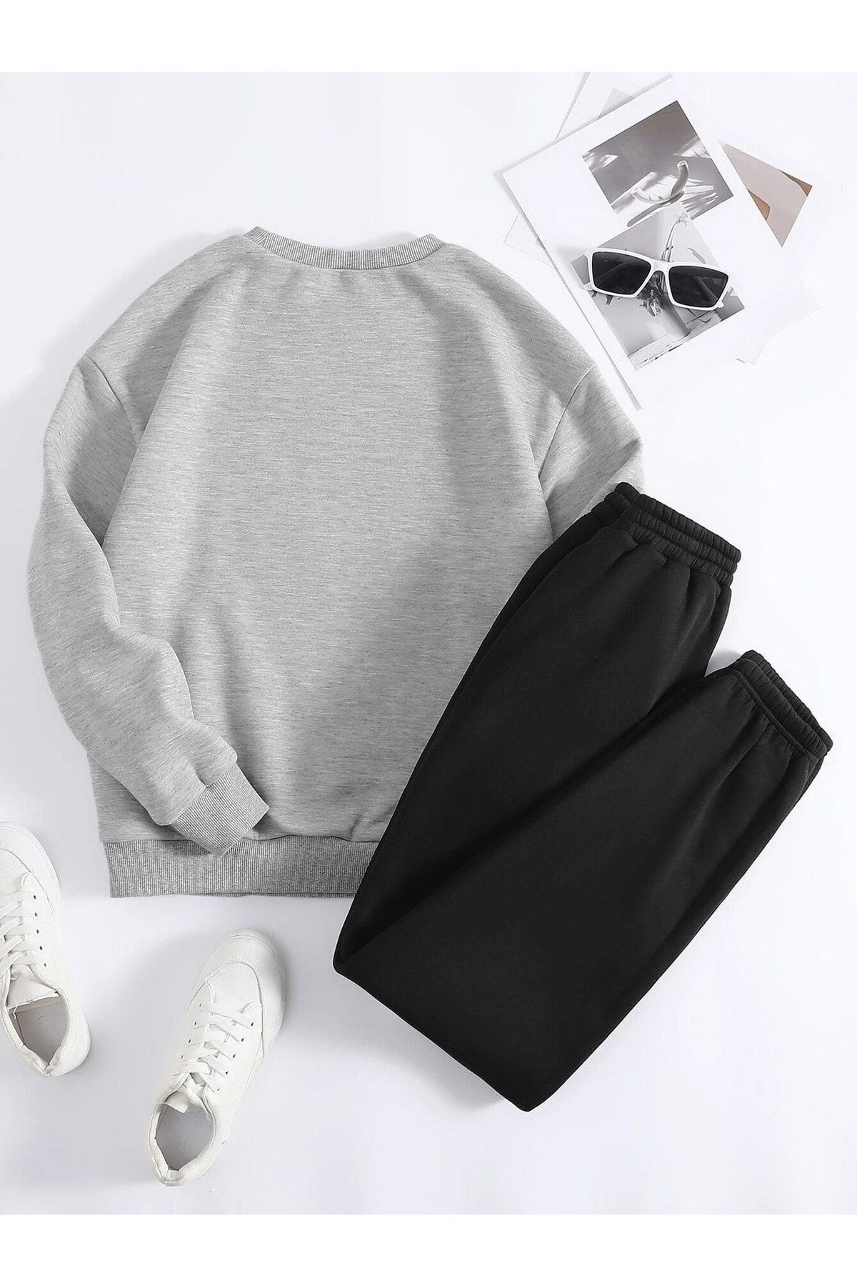 Michigan Eşofman Takımı Gri Sweatshirt Siyah Jogger - Baskılı Oversize Şardonlu Bisiklet Yaka