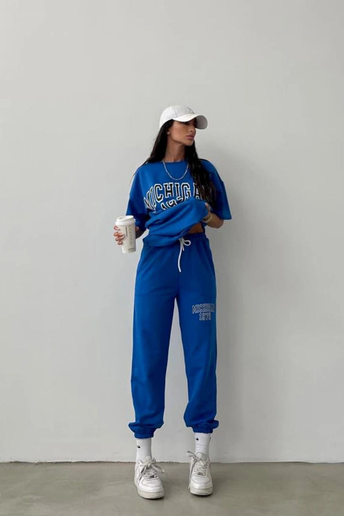 Michigan T-shirt Eşofman Altı Jogger - Mavi Baskı Alt Üst Eşofman Takımı Oversize Bisiklet Yaka
