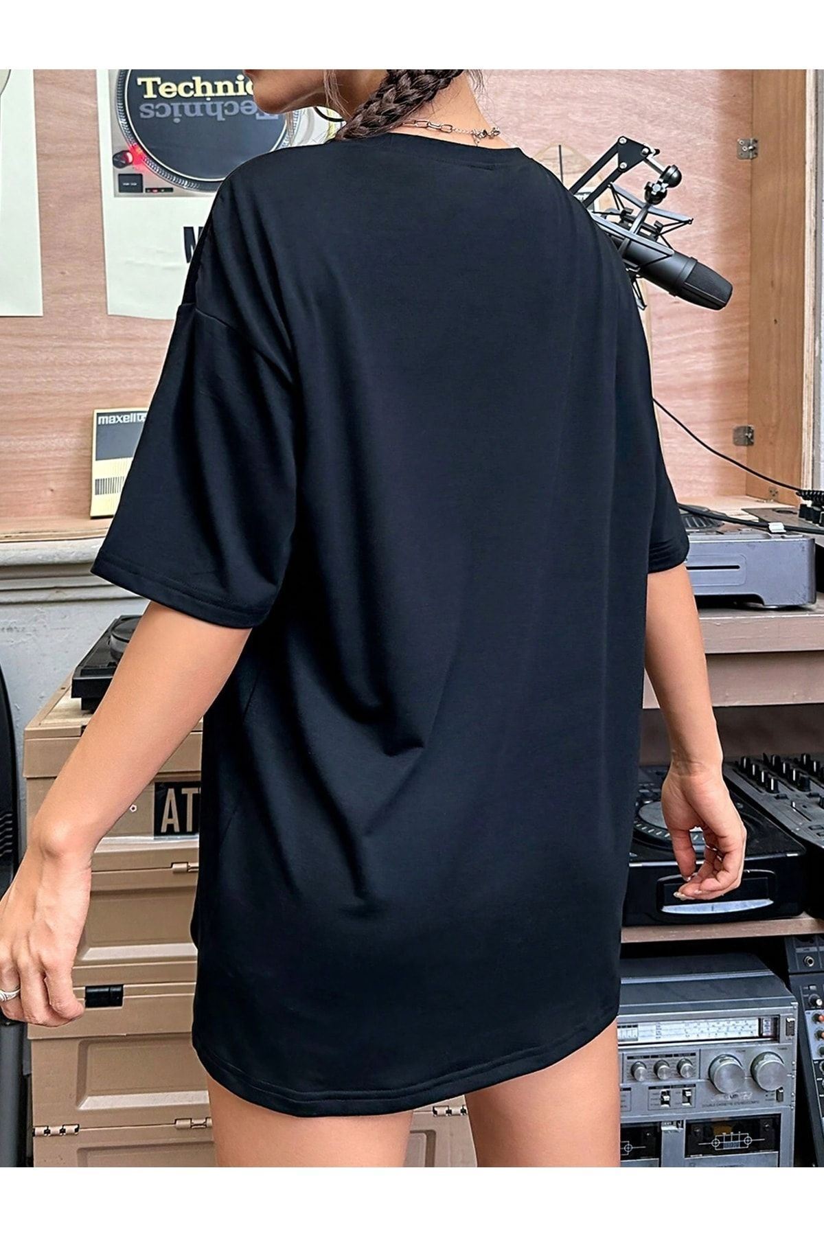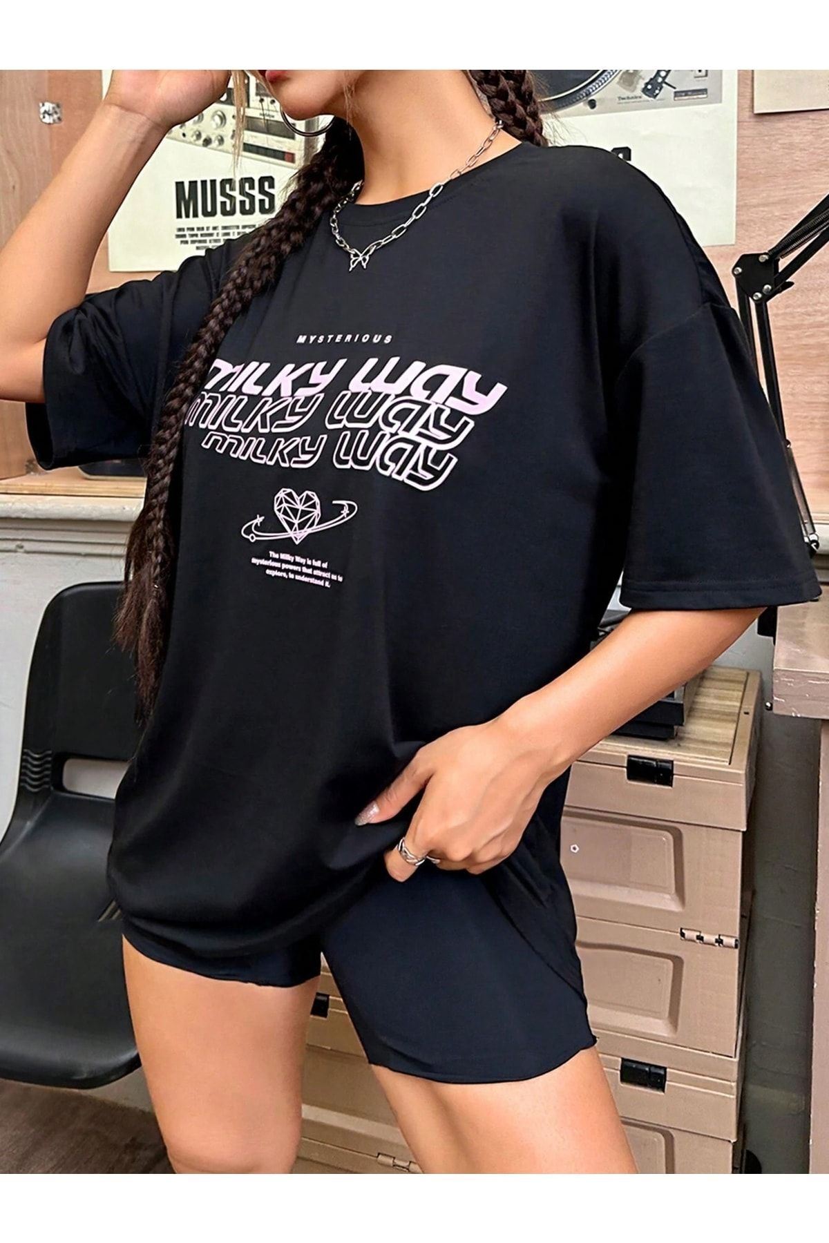 Milky Way T-shirt - Siyah Oversize Baskılı Bisiklet Yaka