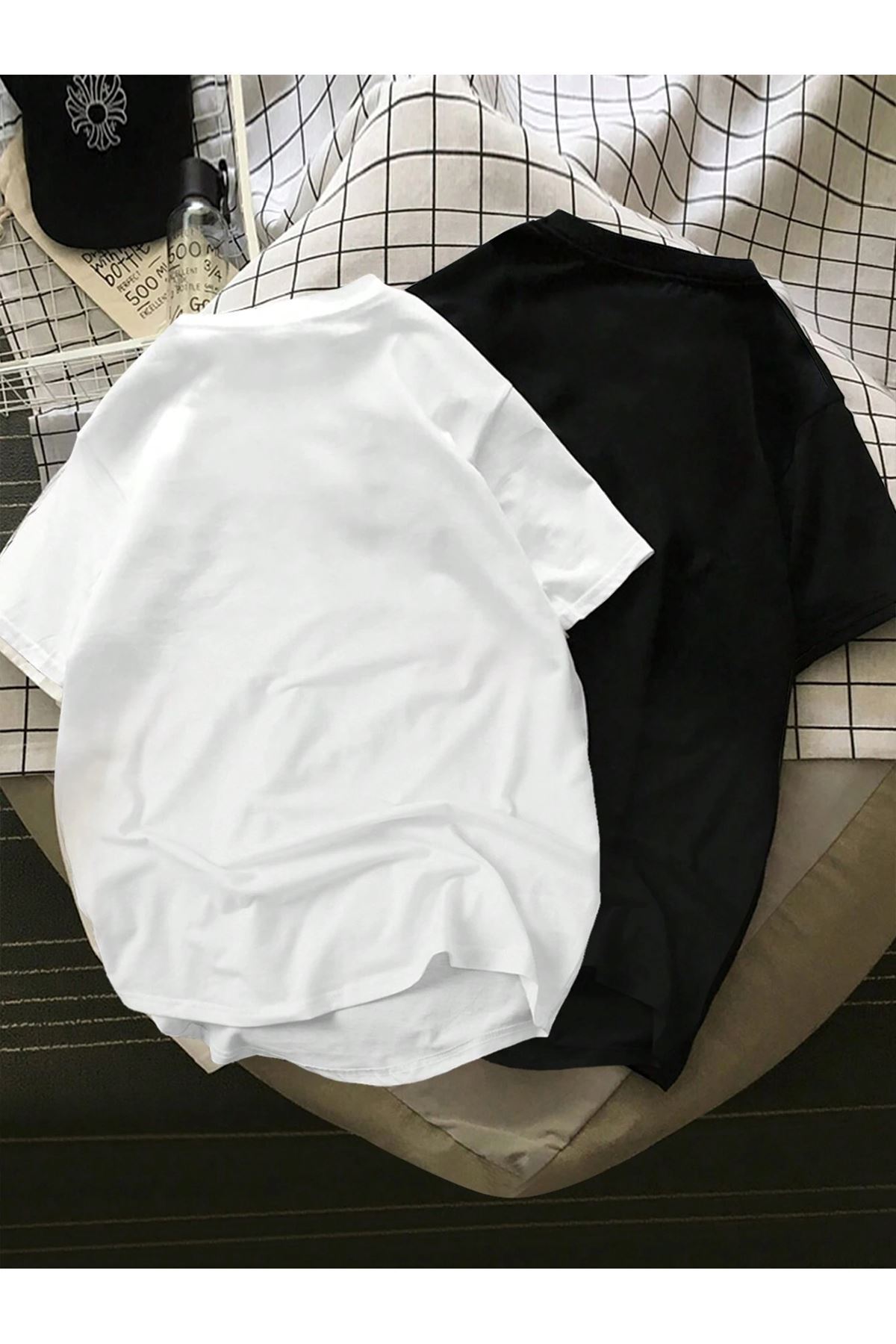Minimal Gül Baskılı Tshirt 2 Li Siyah Beyaz - Oversize Bisiklet yaka Tişört