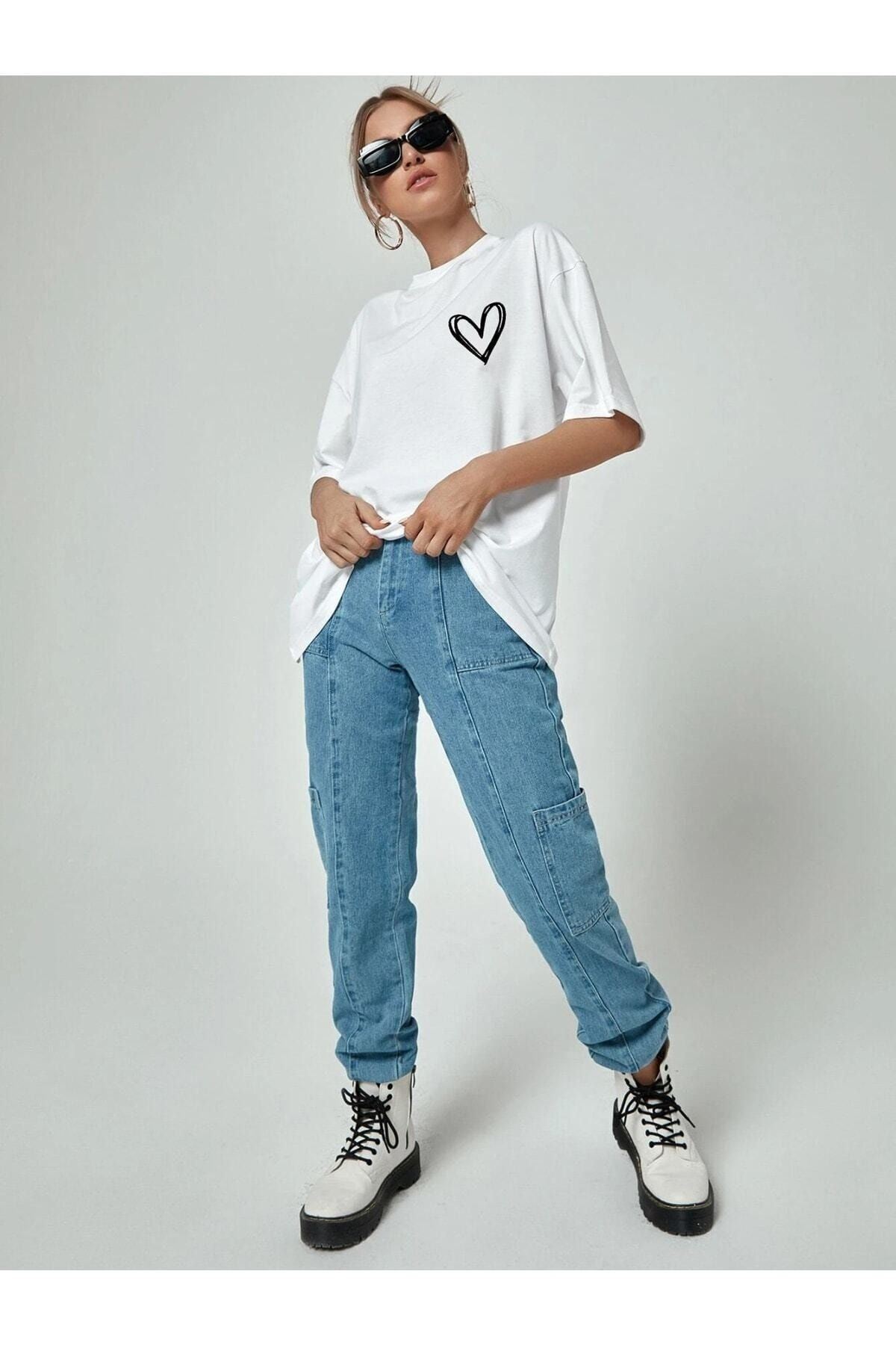 Minimal Kalp T-shirt - Beyaz Baskılı Oversize Bisiklet Yaka Kısa Kol Tişört