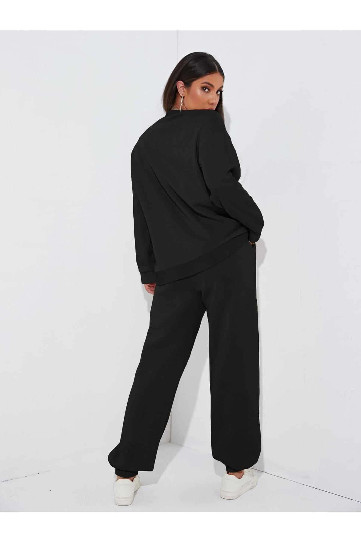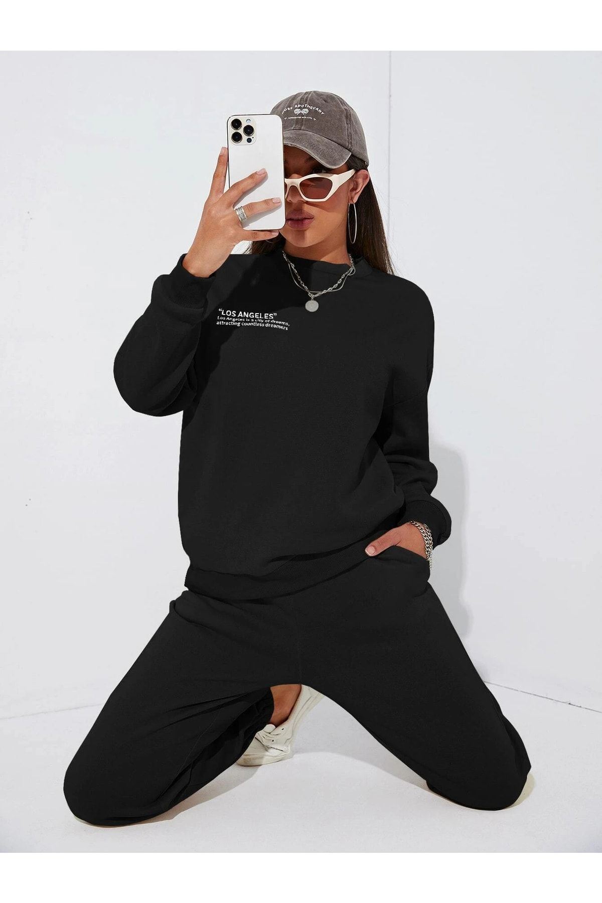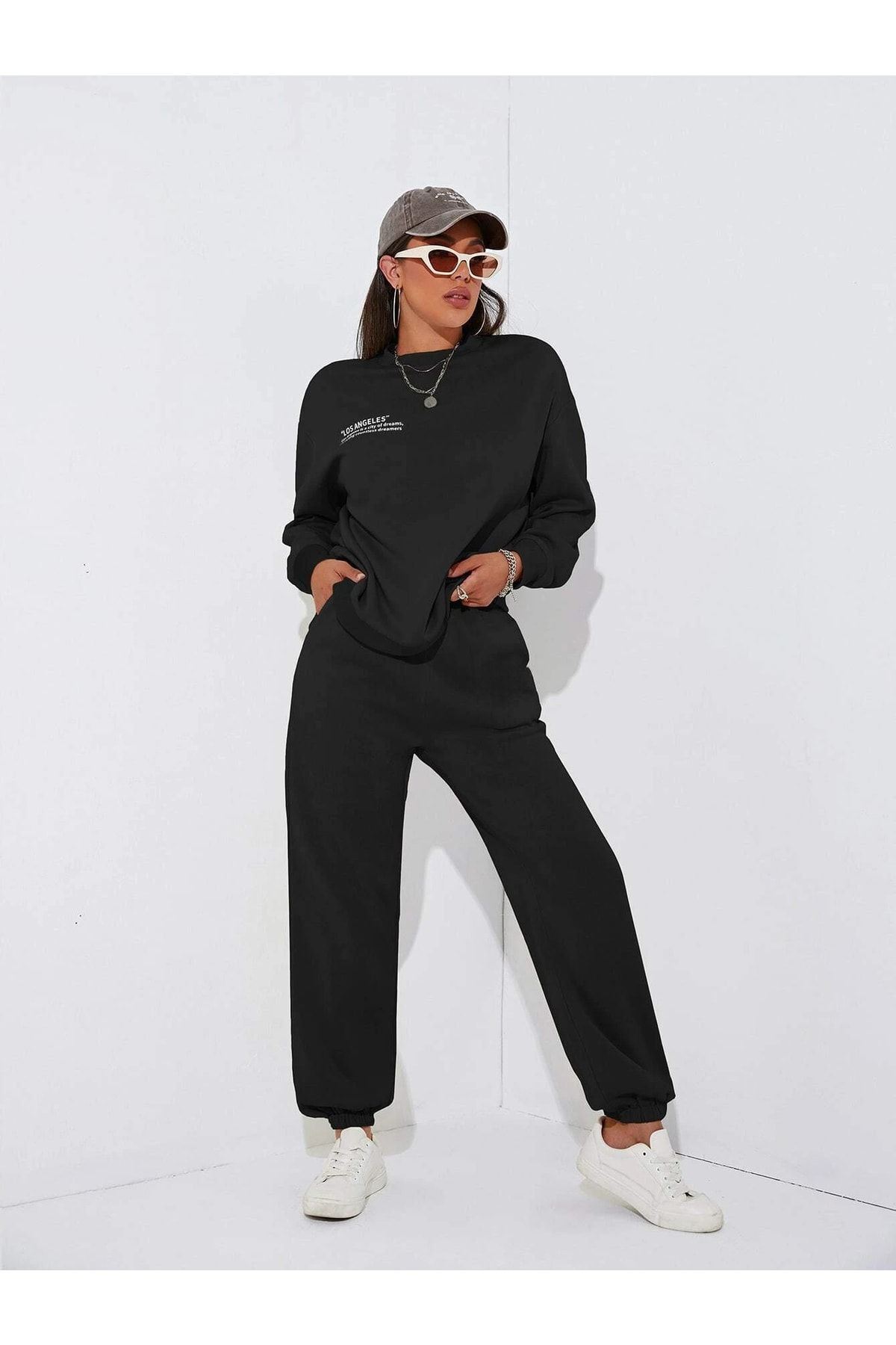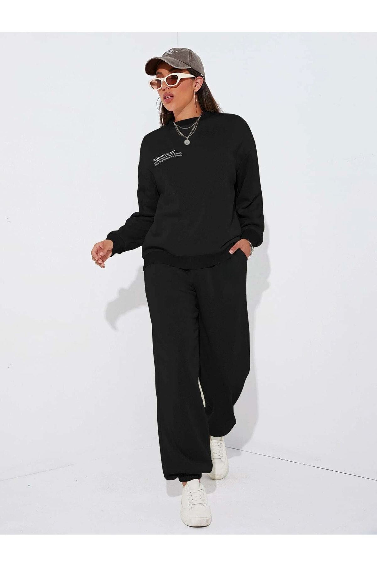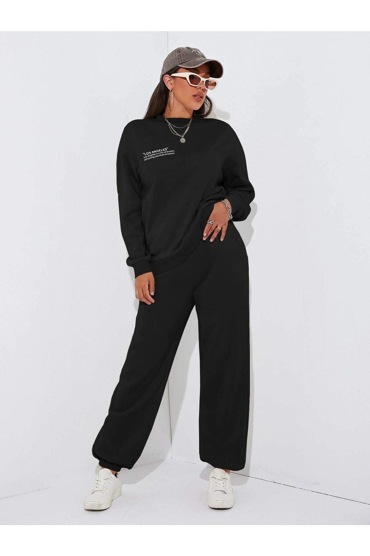 Minimal Los Angeles Sweatshirt Eşofman Altı Jogger- Siyah Alt Üst Takım Oversize Bisiklet Yaka