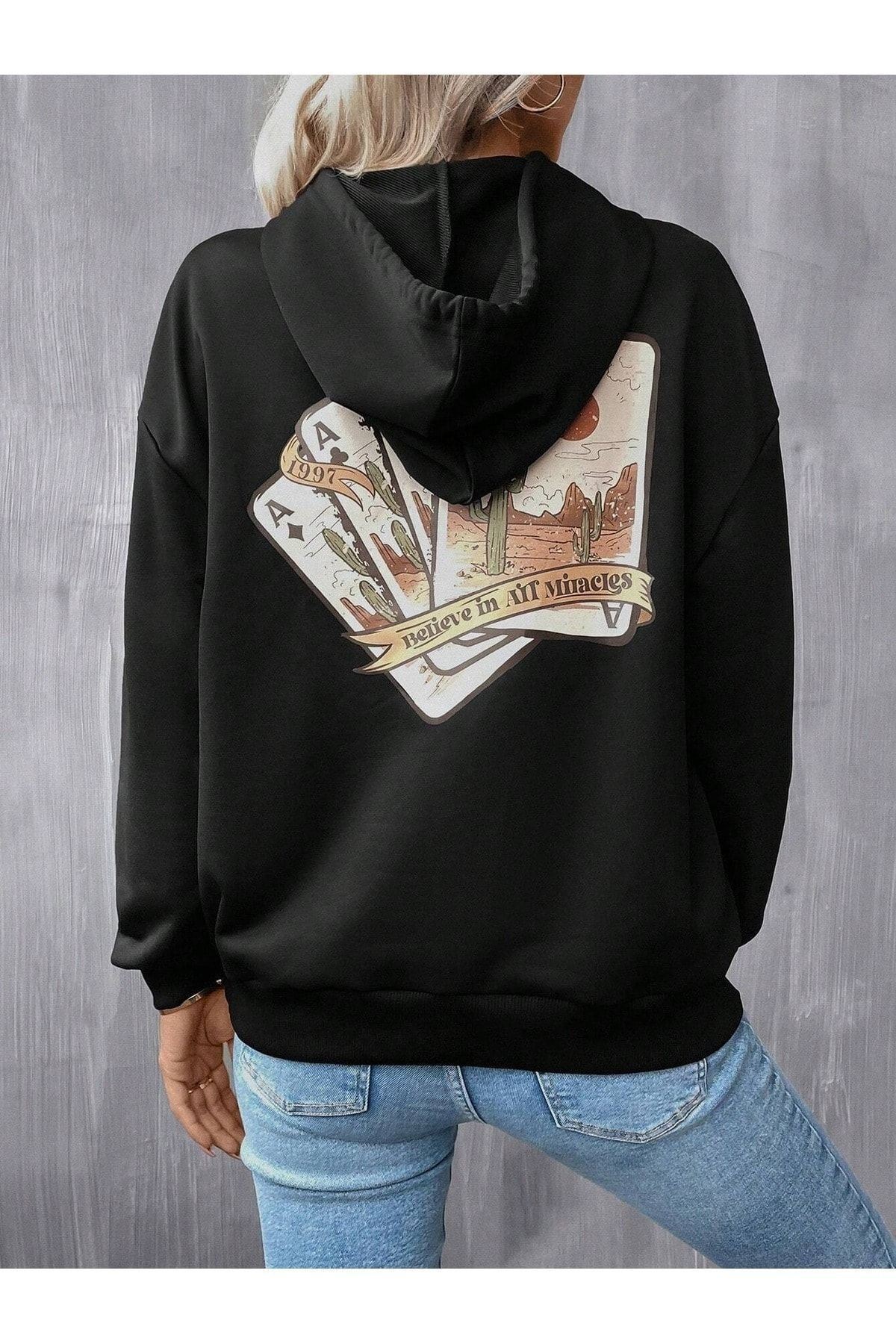 Miracles Card Sweatshirt - Siyah Baskılı Oversize Kapüşonlu