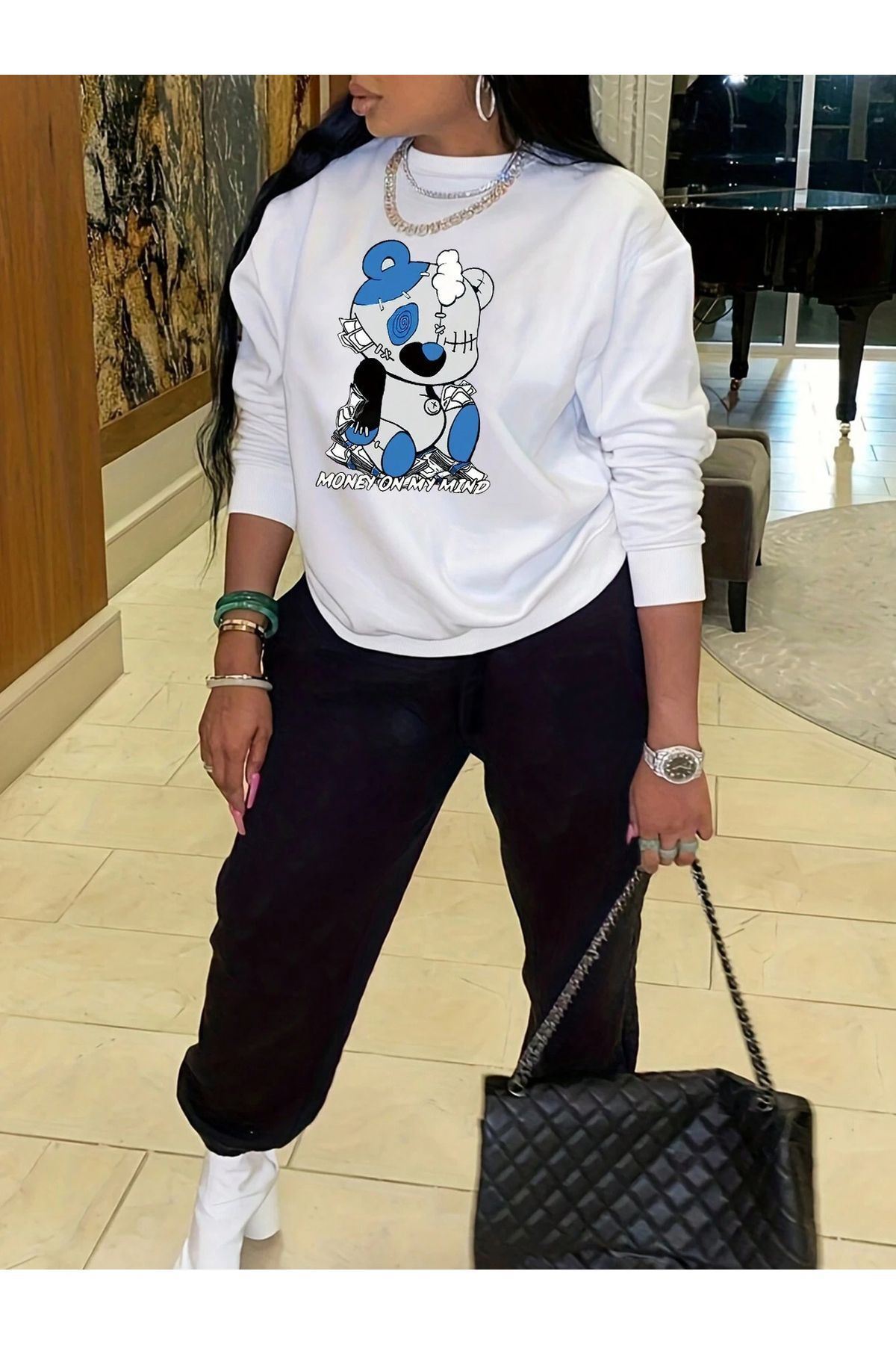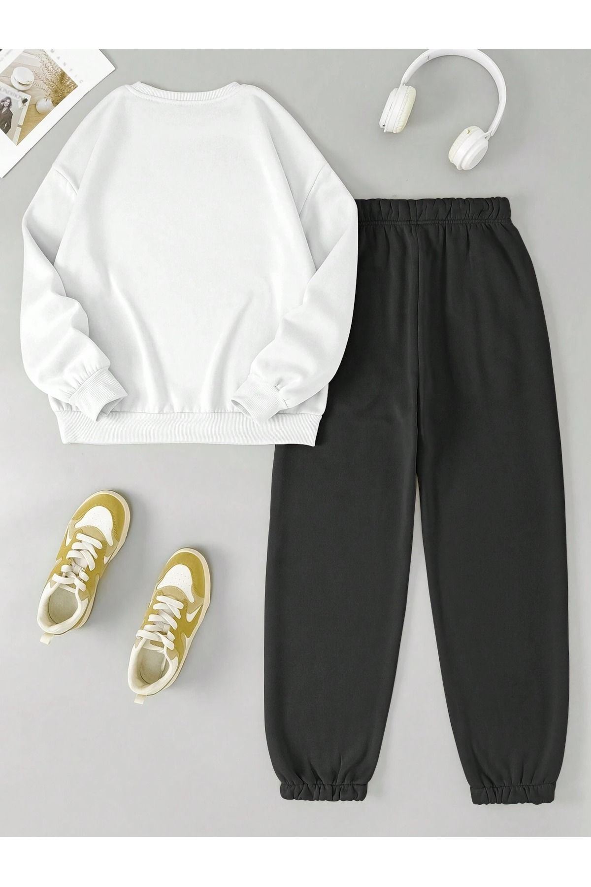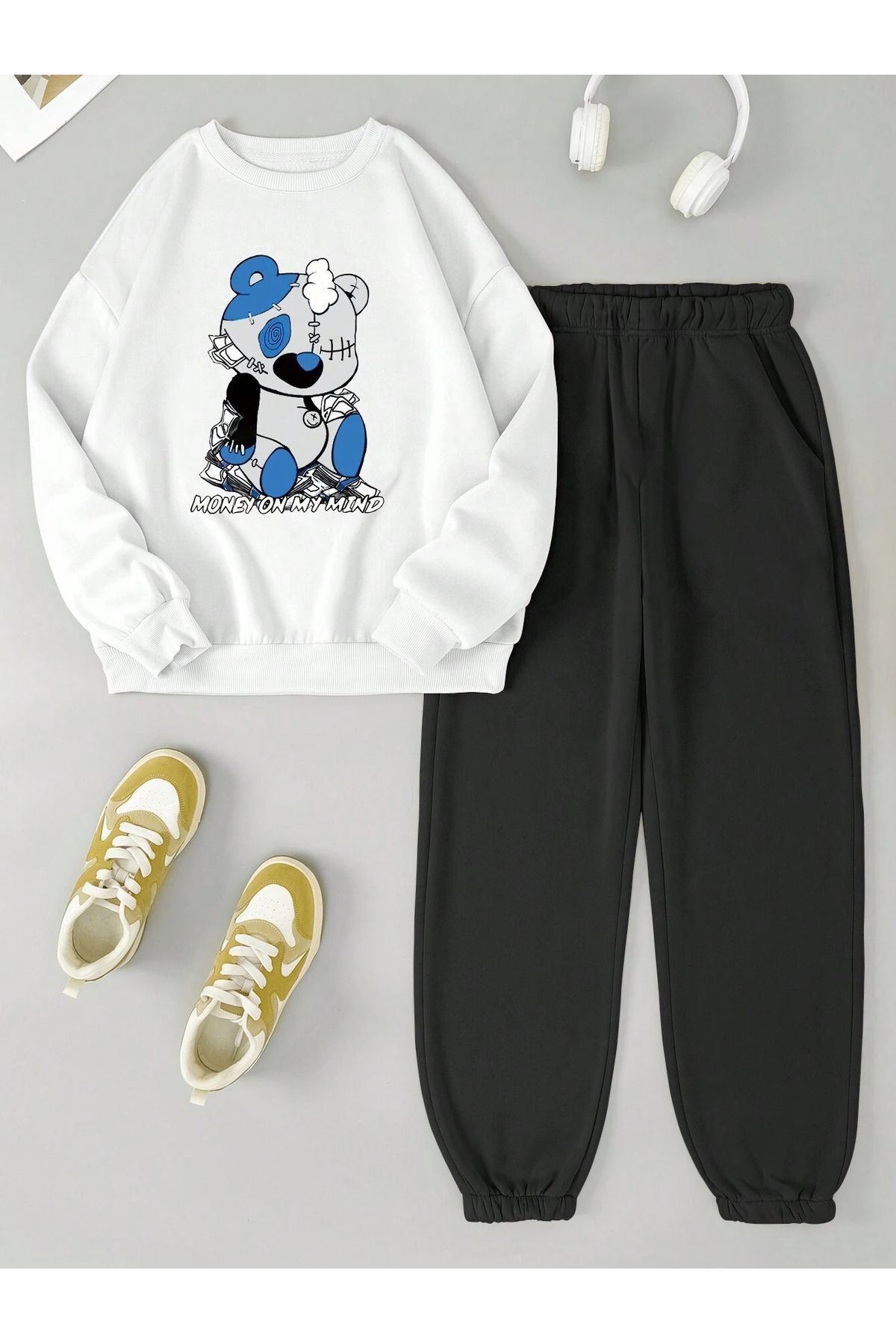 Money Mind Bear Eşofman Takımı - Beyaz Siyah Baskılı Kışlık Bisiklet Yaka