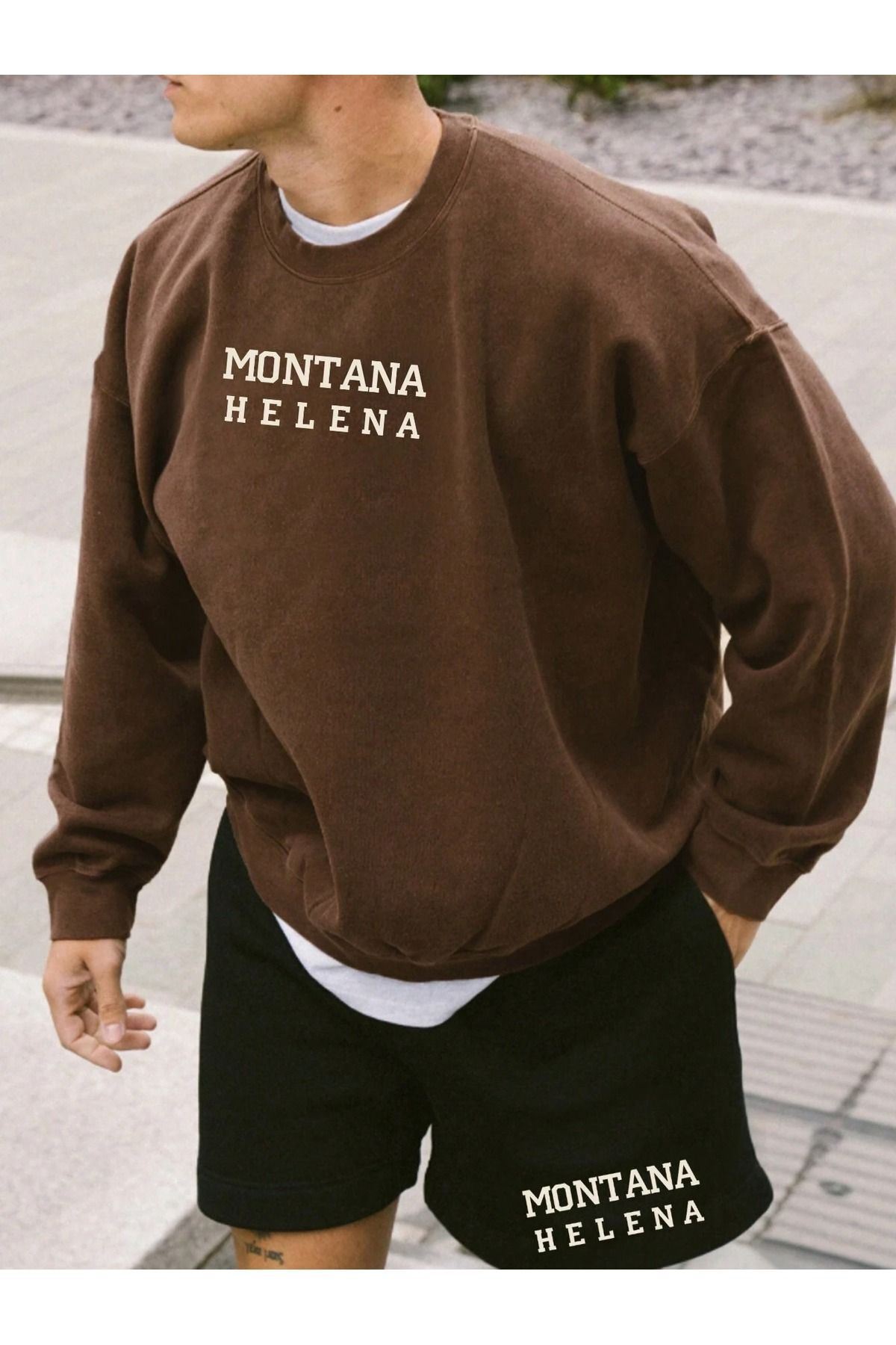 Montana Helena Desen Sweatshirt - Kahverengi Baskılı Oversize Kalın Kışlık Bisiklet Yaka