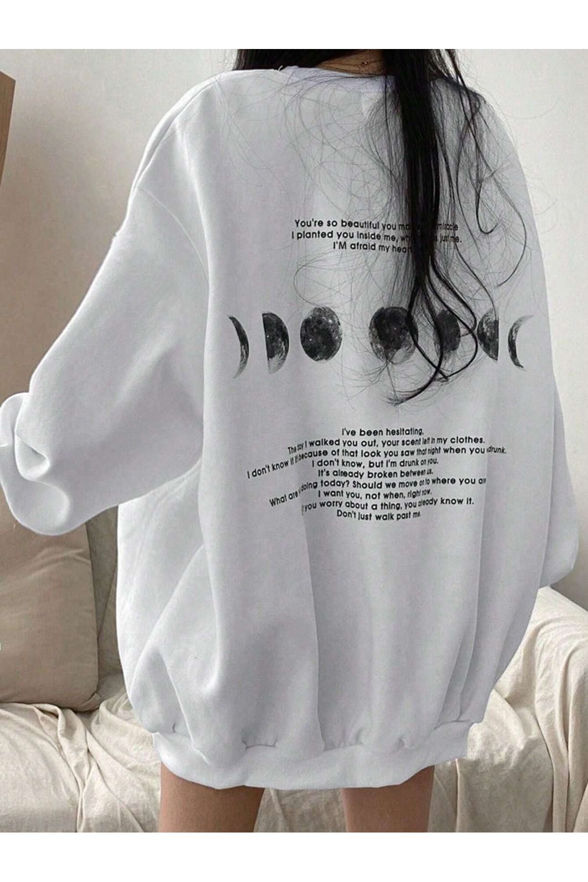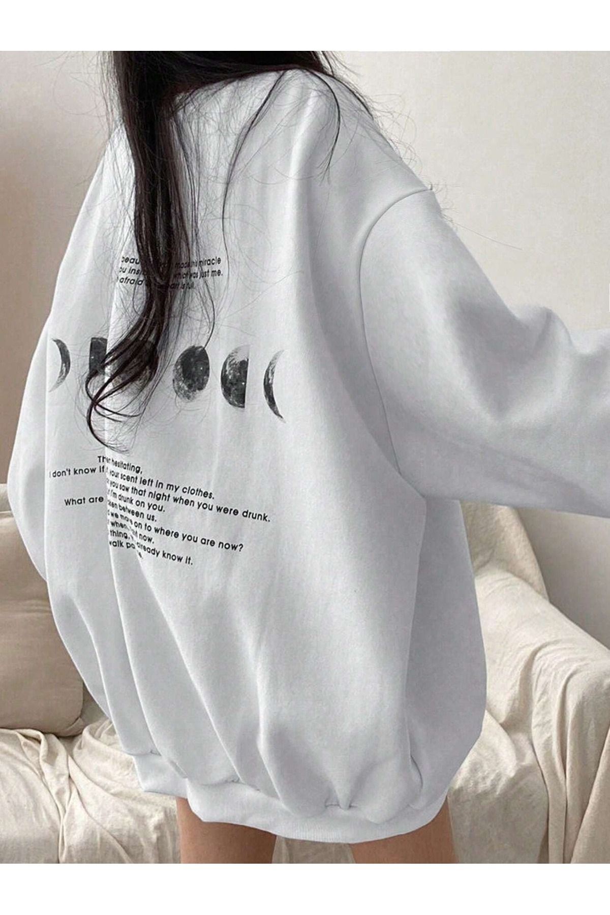 Moon Phases Afraid Kışlık Kalın Sweatshirt - Beyaz Baskılı Oversize Kalın Kışlık Bisiklet Yaka