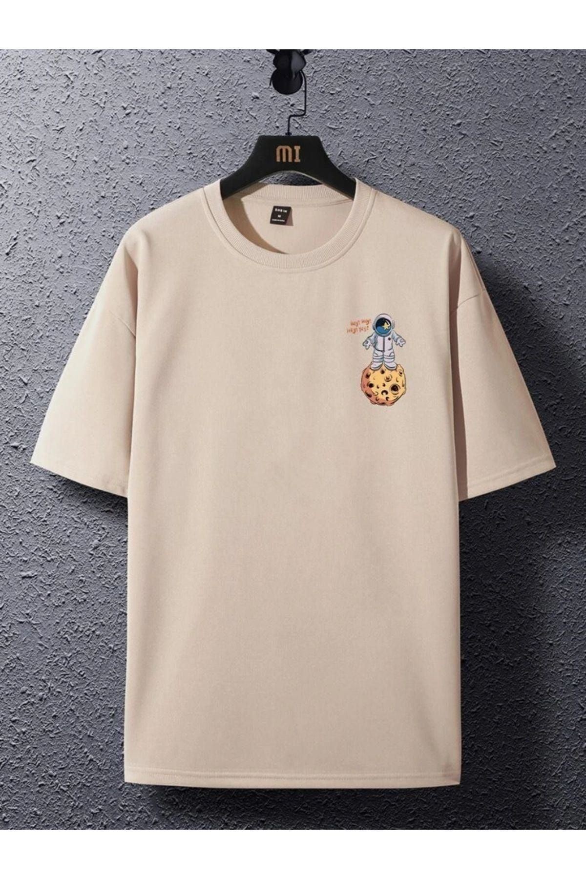 Moon To Mars T-Shirt - Bej Baskılı Oversize Bisiklet Yaka Kısa Kol