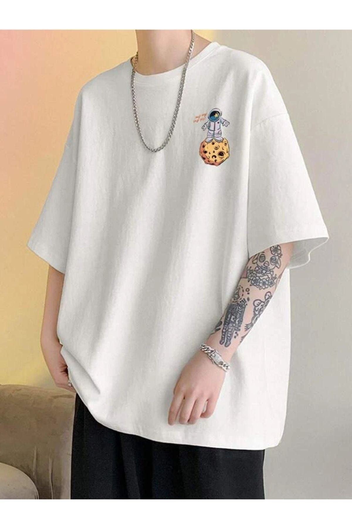 Moon To Mars T-Shirt - Beyaz Baskılı Oversize Bisiklet Yaka Kısa Kol