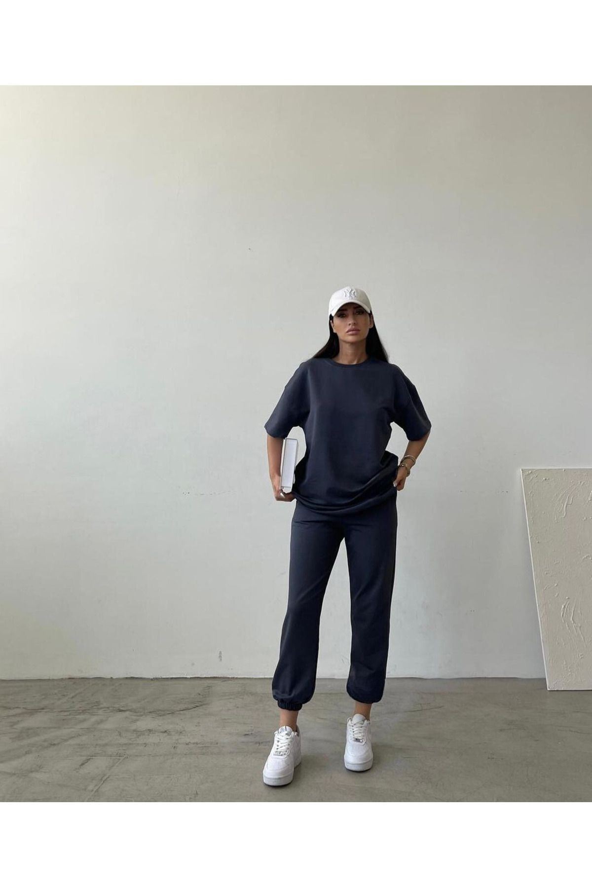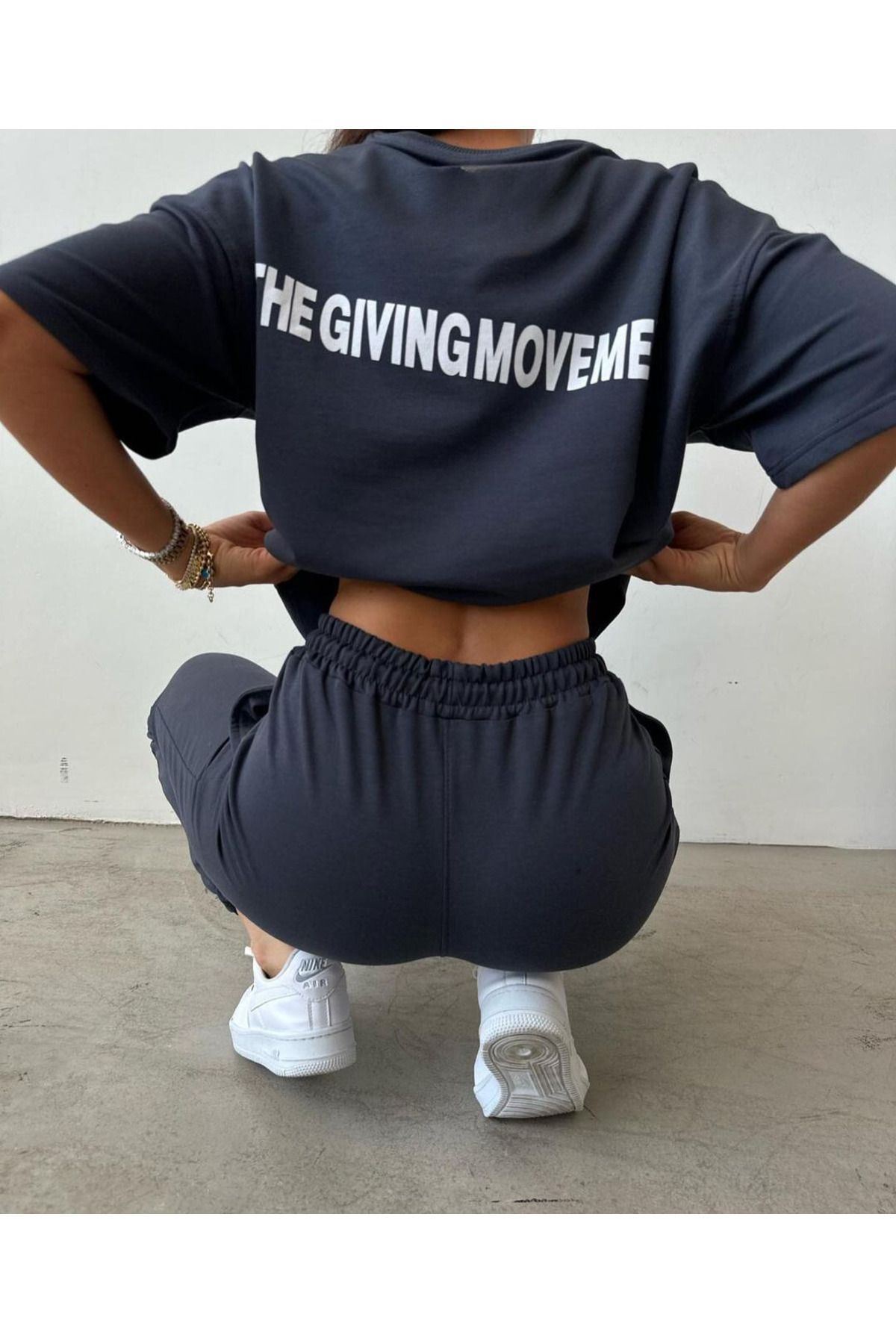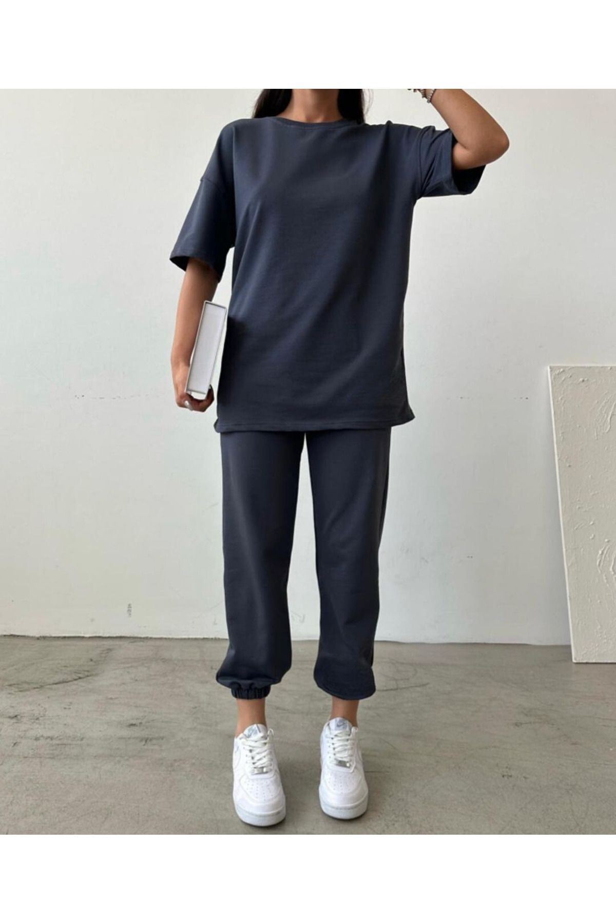 Movement T-shirt Eşofman Altı Jogger- Mavi Baskılı Alt Üst Eşofman Takım Oversize Bisiklet Yaka