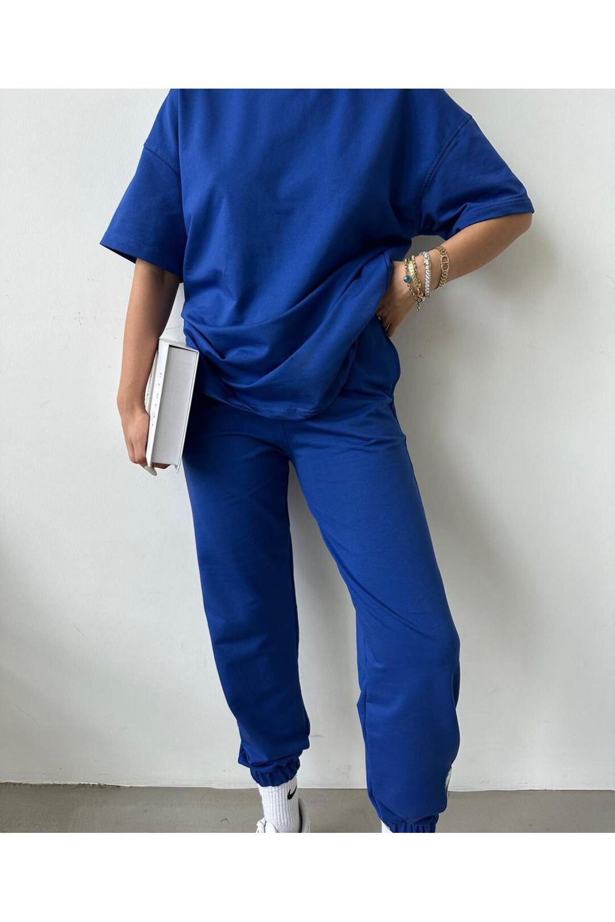 Movement T-shirt Eşofman Altı Jogger- Mavi Baskılı Alt Üst Eşofman Takım Oversize Bisiklet Yaka