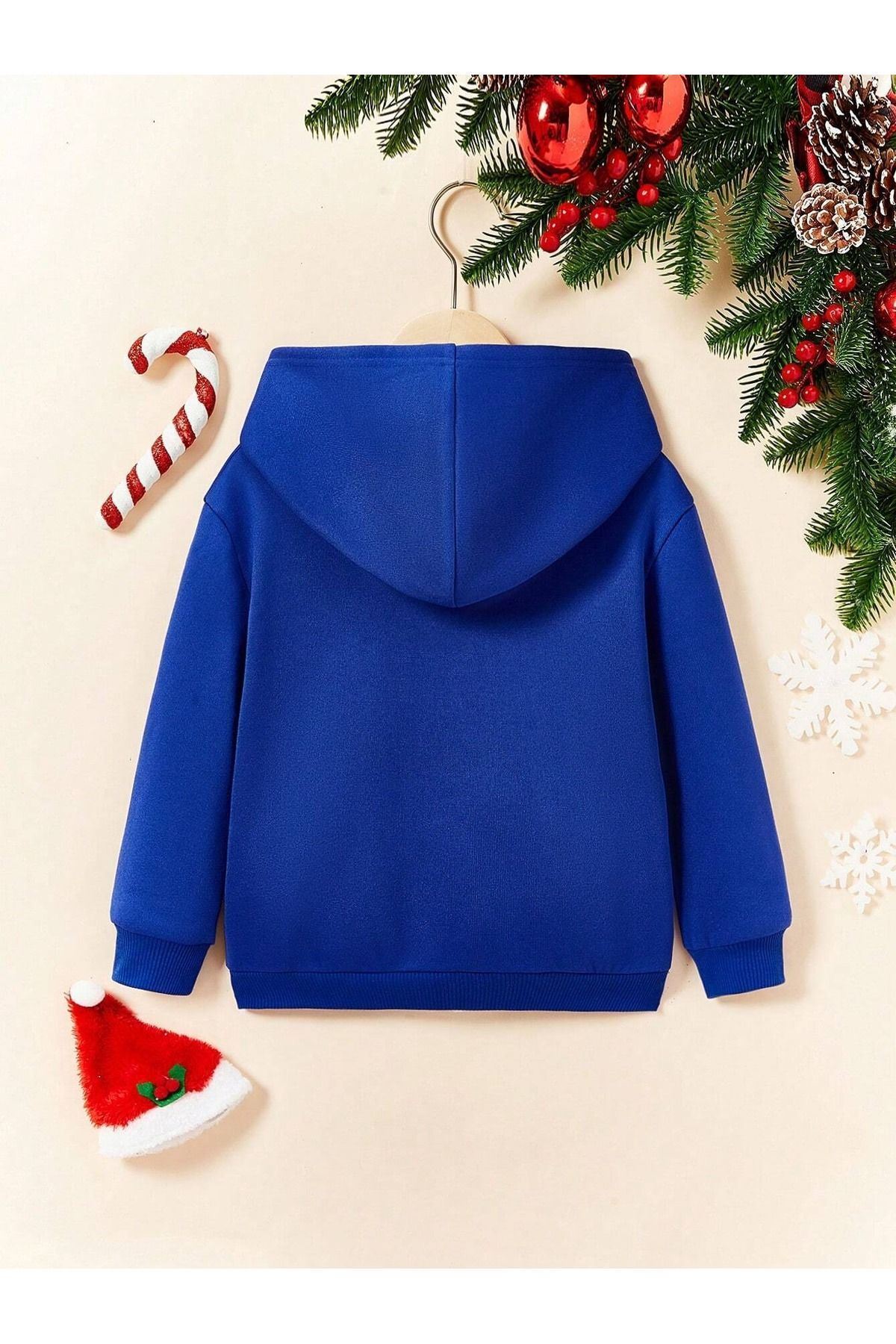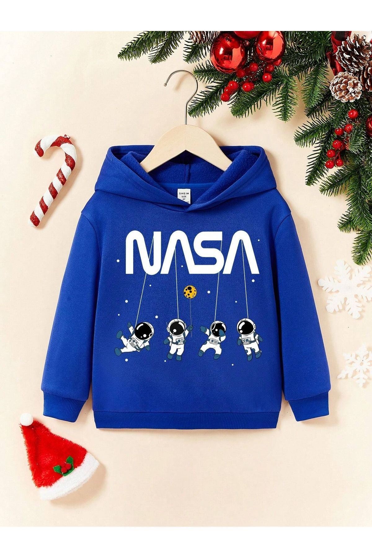 Nasa Astronot Pamuklu Çocuk Sweatshirt - Sax Mavi Baskılı Kız Erkek Çocuk Kışlık Cepli Kapüşonlu