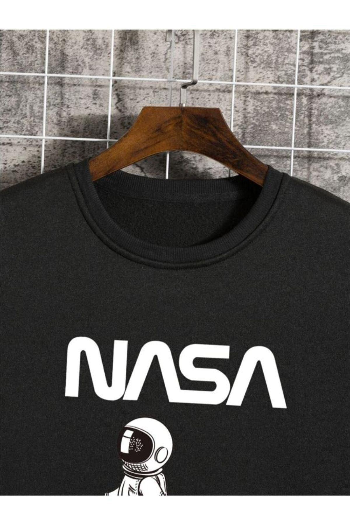 Nasa Uzay Sweatshirt - Siyah Baskılı Oversize Bisiklet Yaka