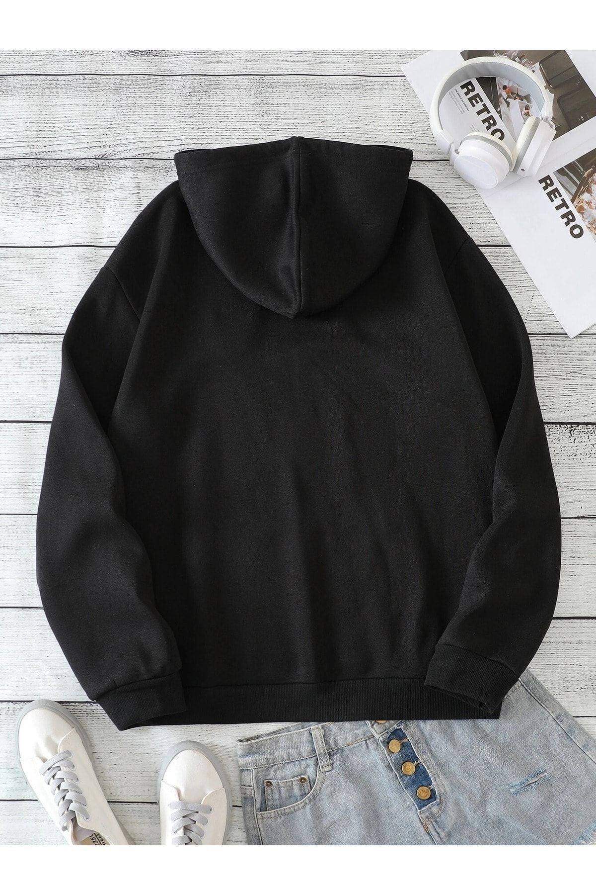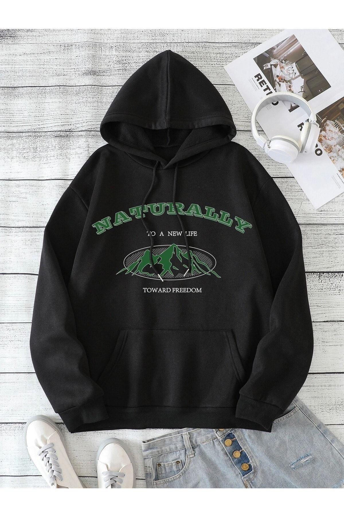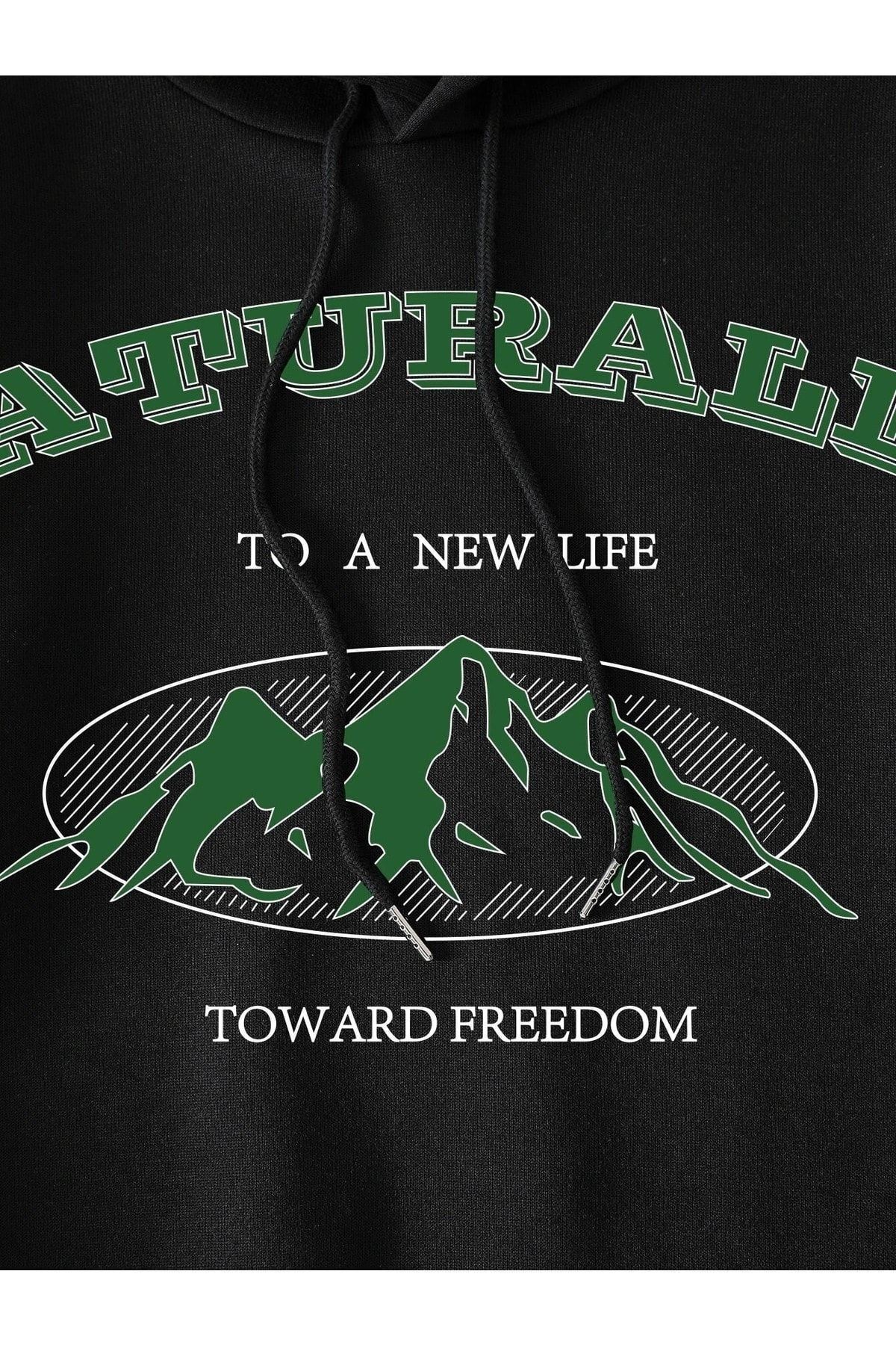 Naturally Dağ Sweatshirt - Siyah Baskılı Oversize Kapüşonlu