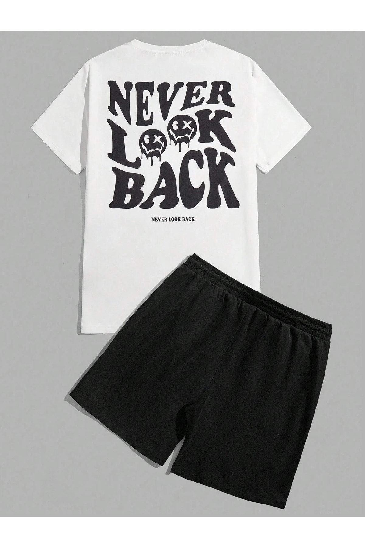 Never Look Back T-Shirt Şort - Beyaz Siyah Alt Üst Takım Şort Tişört Kombin Baskılı Bisiklet Yaka