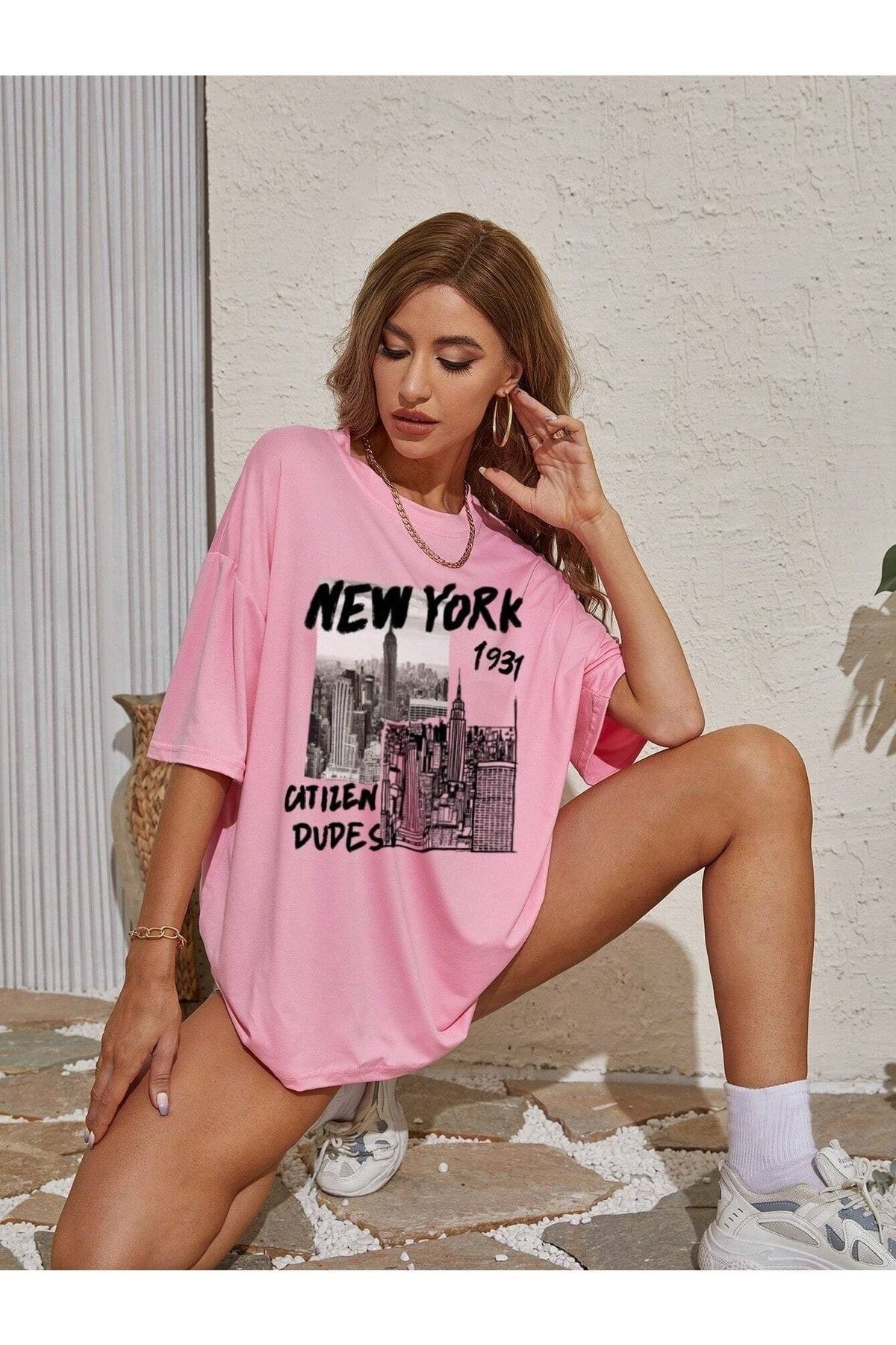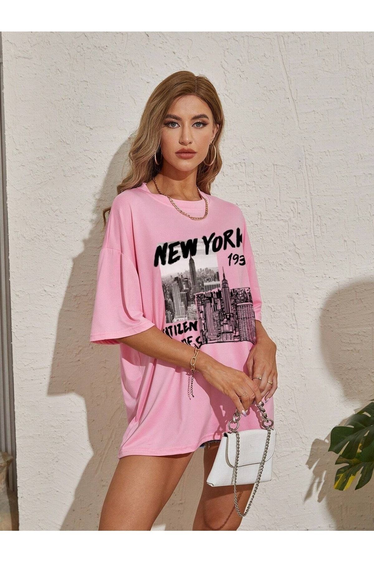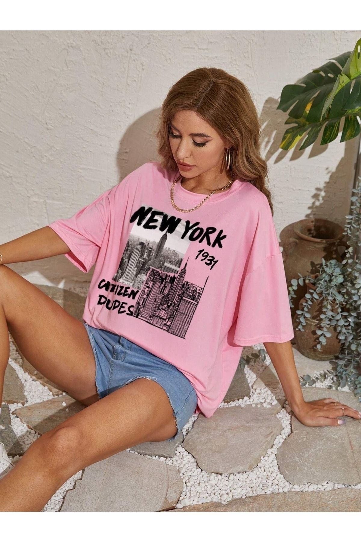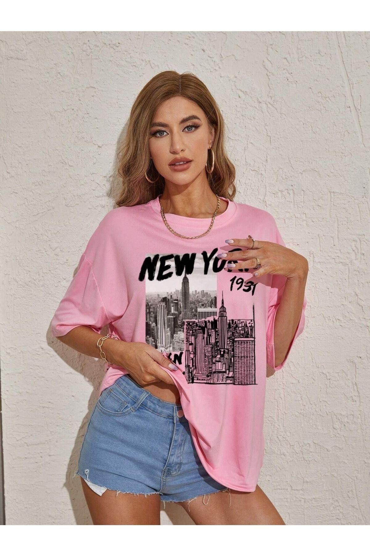 New York 1931 T-shirt - Pembe Oversize Baskılı Bisiklet Yaka