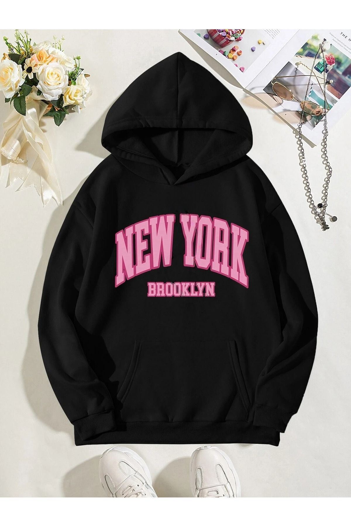New York Brooklyn FFCBDB Sweatshirt - Siyah Baskılı Oversize Kapüşonlu