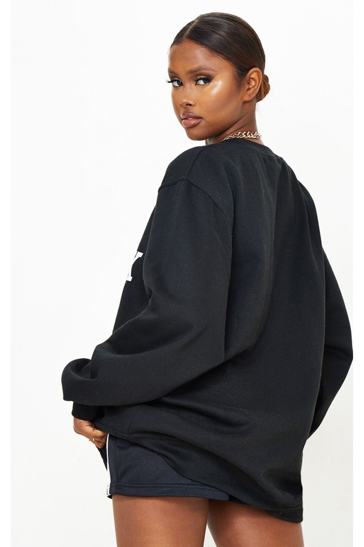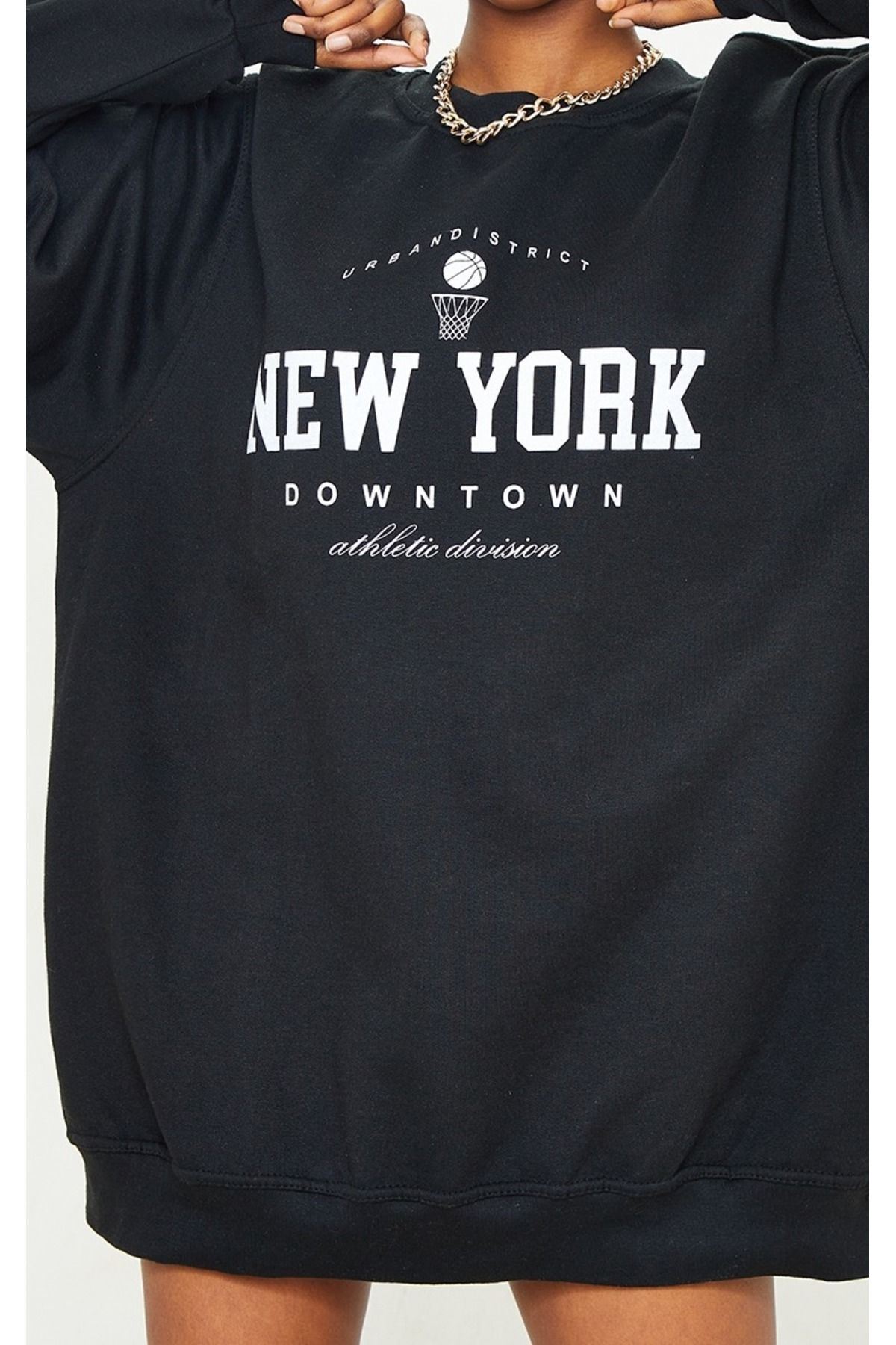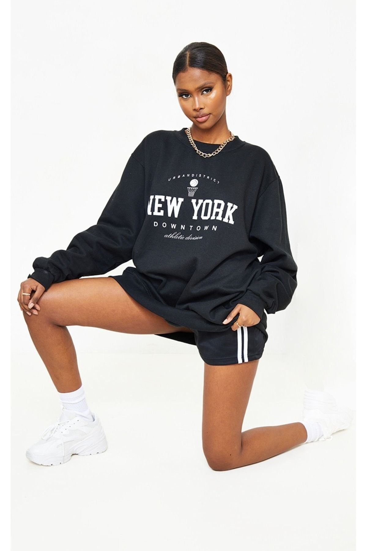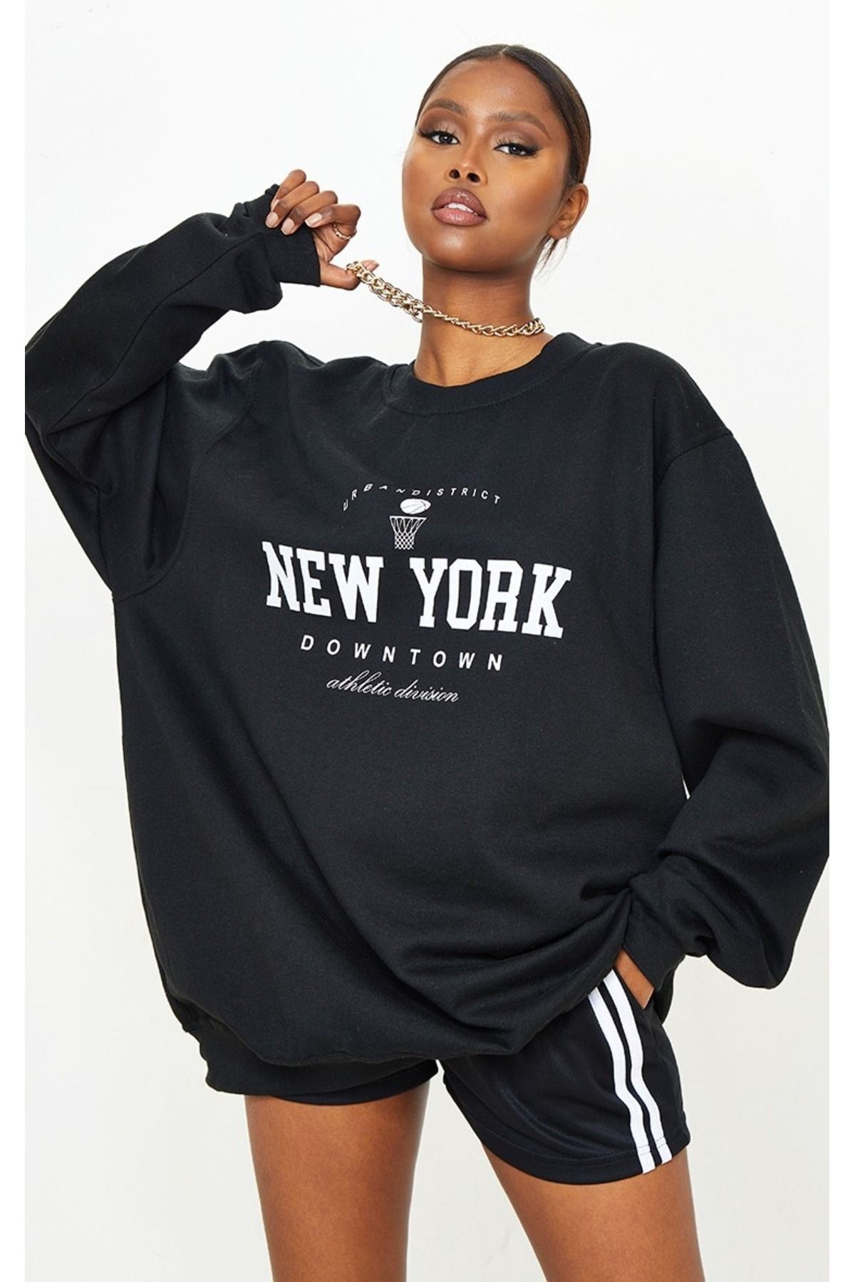 New York Downtown Sweatshirt - Siyah Baskılı Oversize Bisiklet Yaka