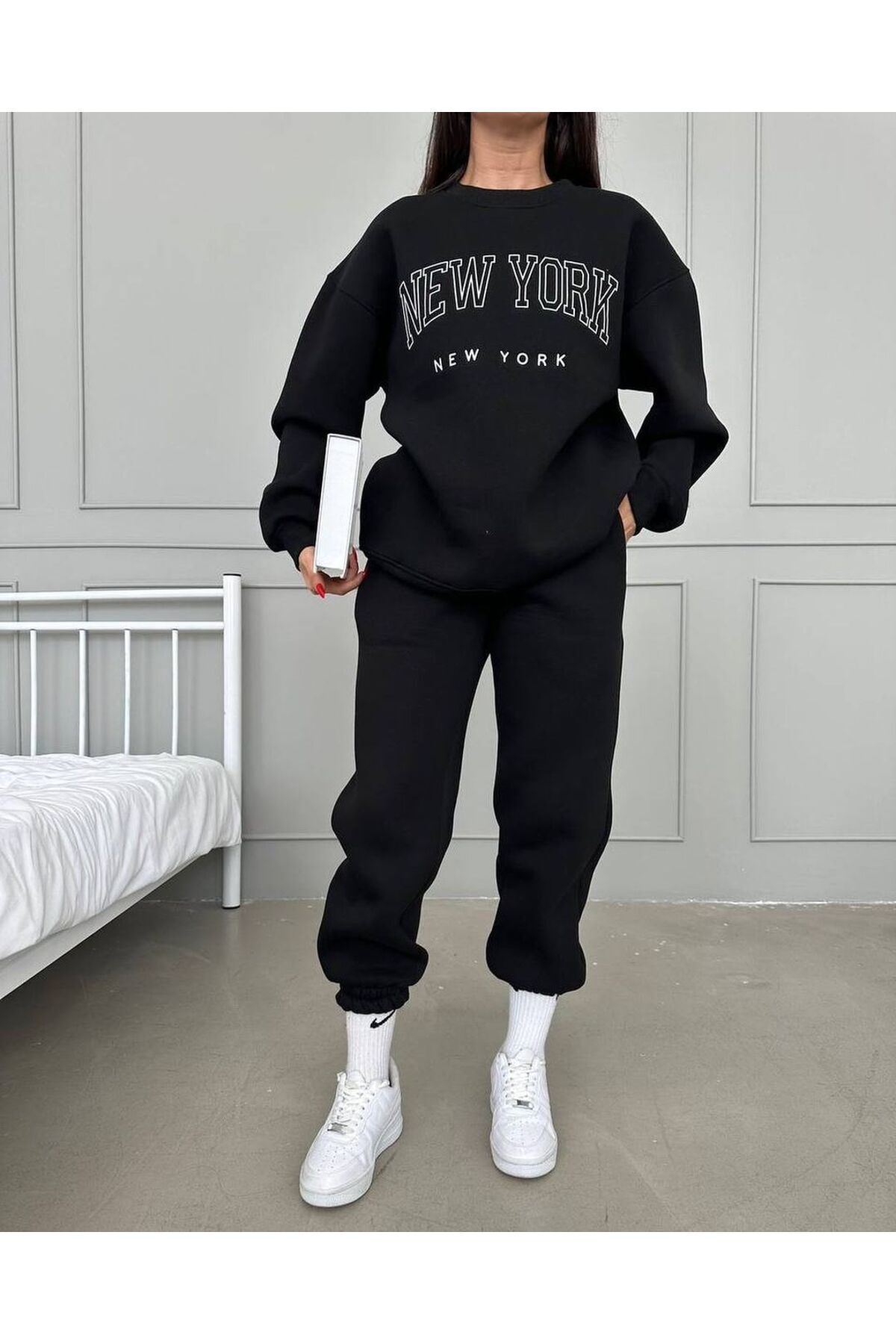 New York New York Eşofman Takımı Sweatshirt Jogger - Siyah Baskılı Oversize Şardonlu Bisiklet Yaka
