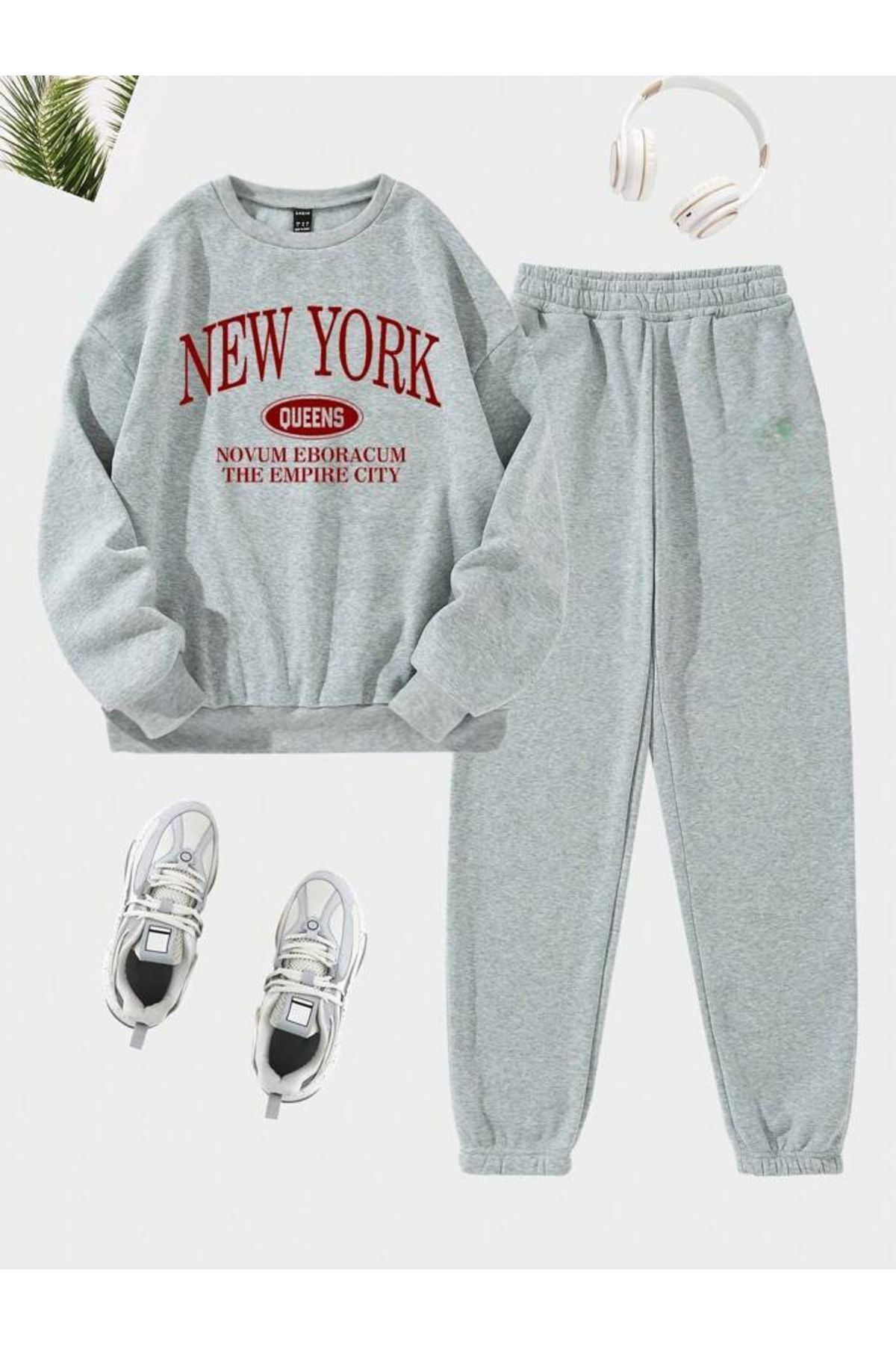 New York Queens Eşofman Takımı Sweatshirt Jogger - Gri Baskılı Oversize Şardonlu Bisiklet Yaka