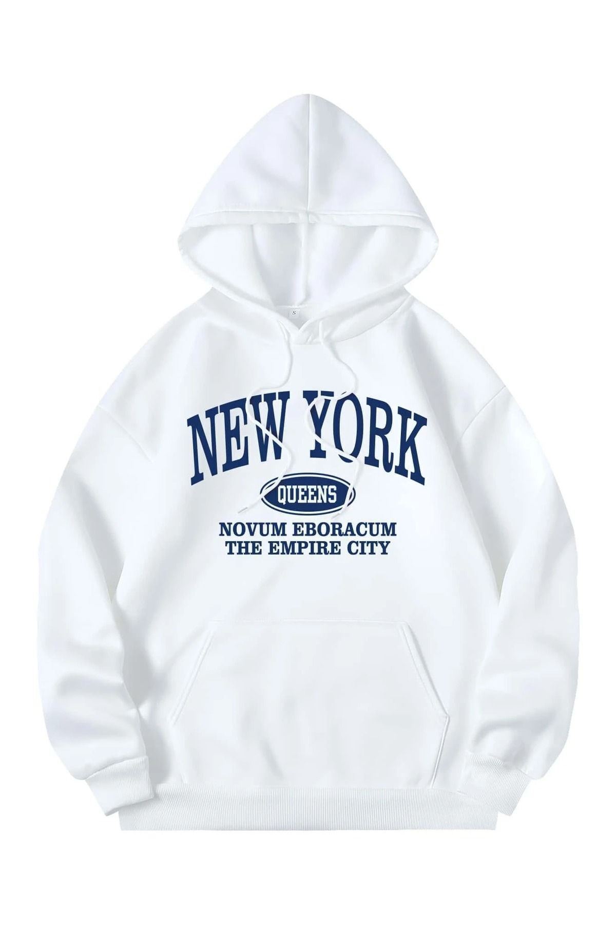 New York Queens Sweatshirt - Beyaz Baskılı Oversize Kapüşonlu