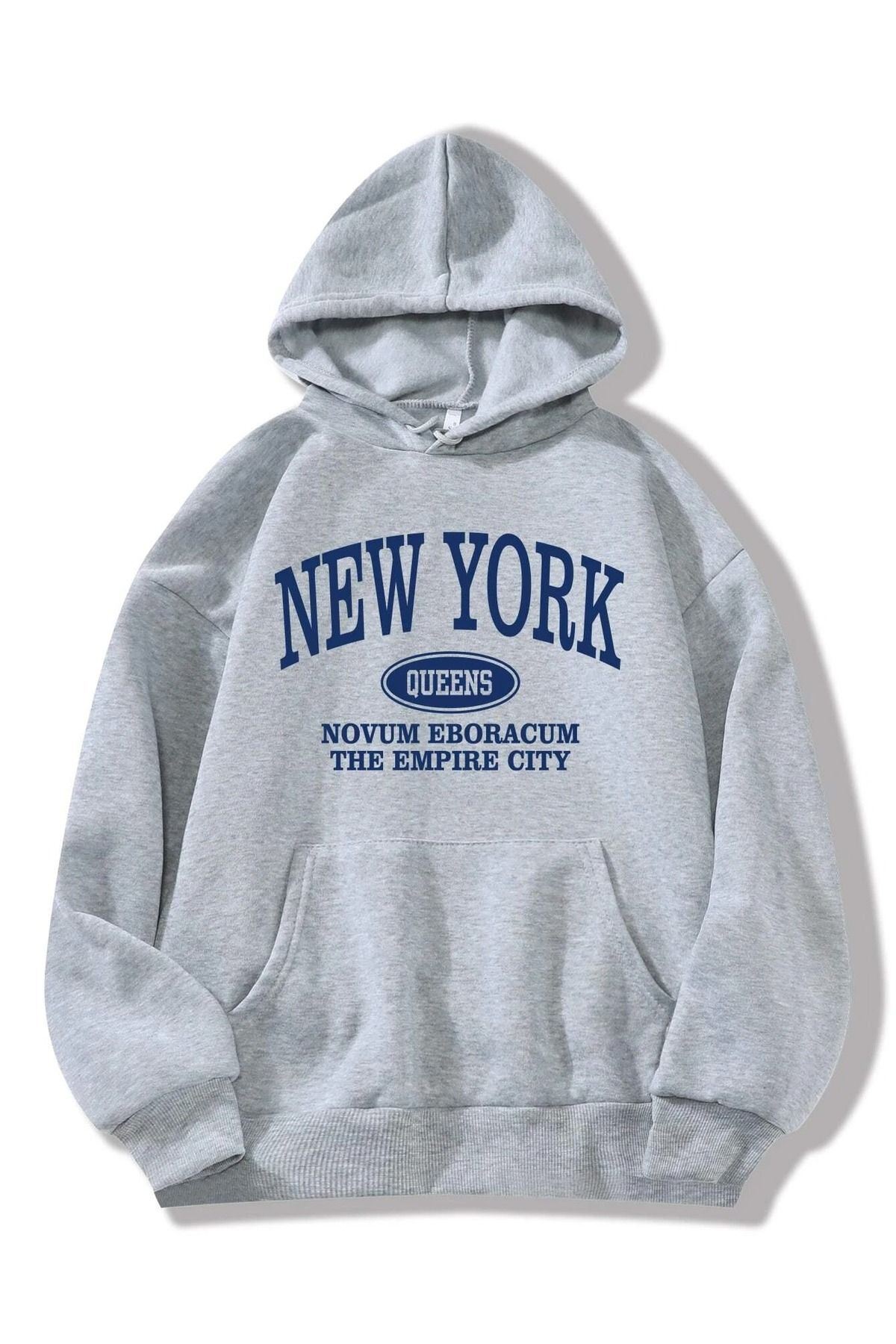 New York Queens Sweatshirt - Gri Baskılı Oversize Kapüşonlu