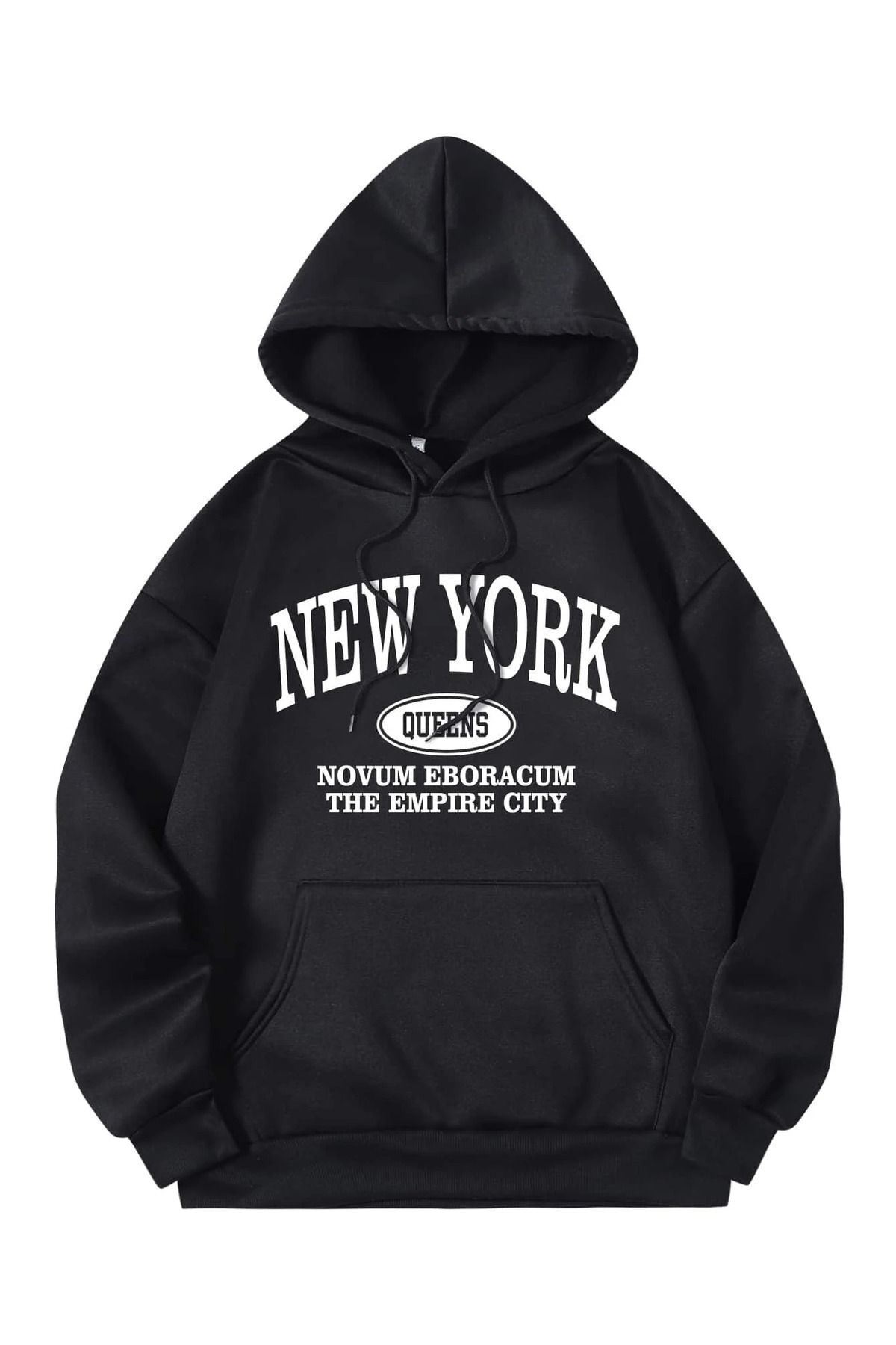 New York Queens Sweatshirt - Siyah Baskılı Oversize Kapüşonlu