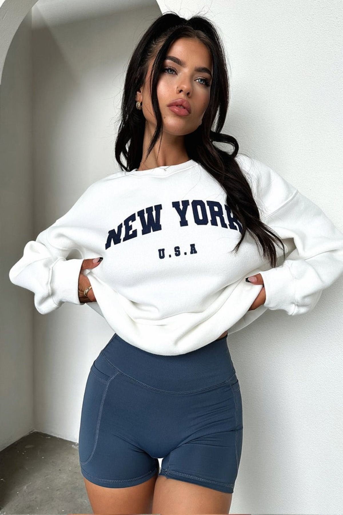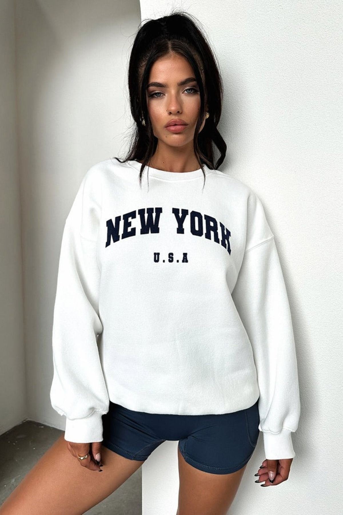 New York U.S.A Sweatshirt - Beyaz Baskılı Oversize Bisiklet Yaka