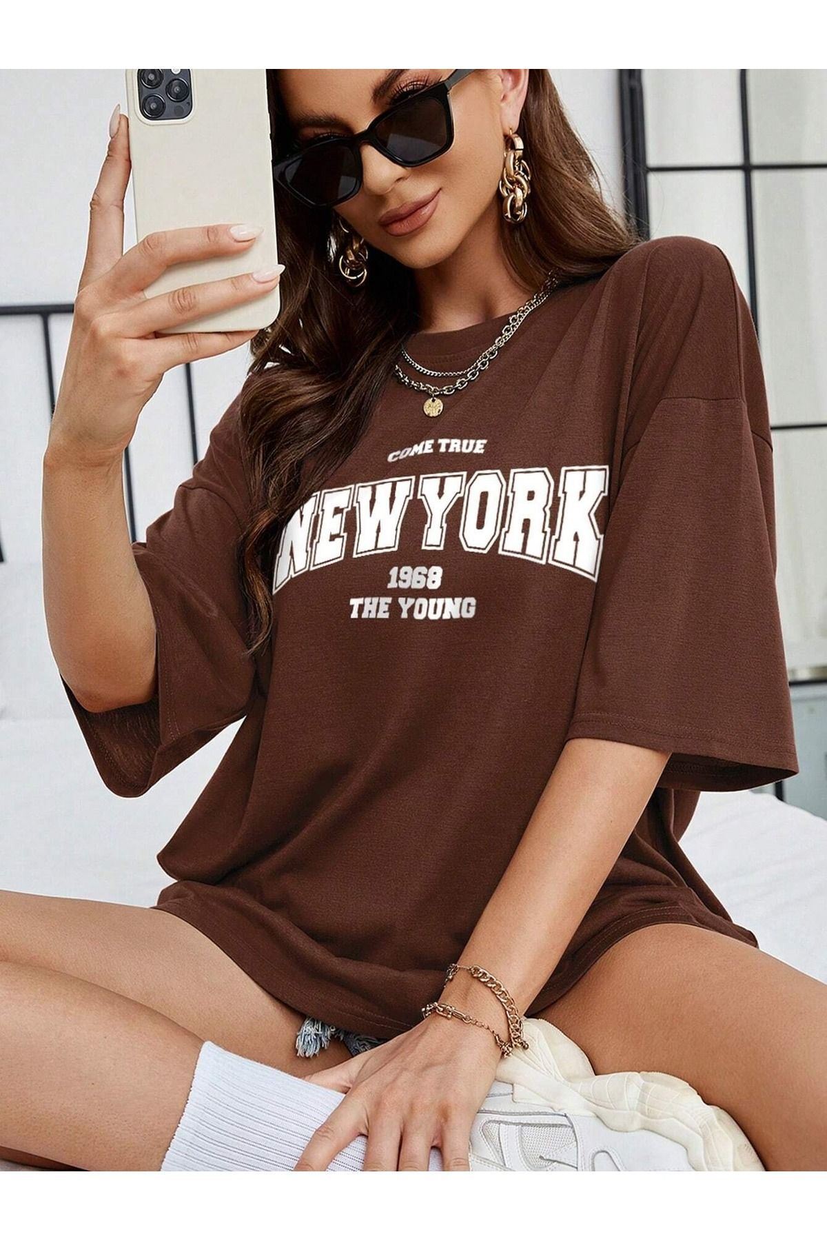 Newyork 1968 Young Süprem T-Shirt - Kahverengi Baskılı Oversize Bisiklet Yaka Kısa Kol Tişört