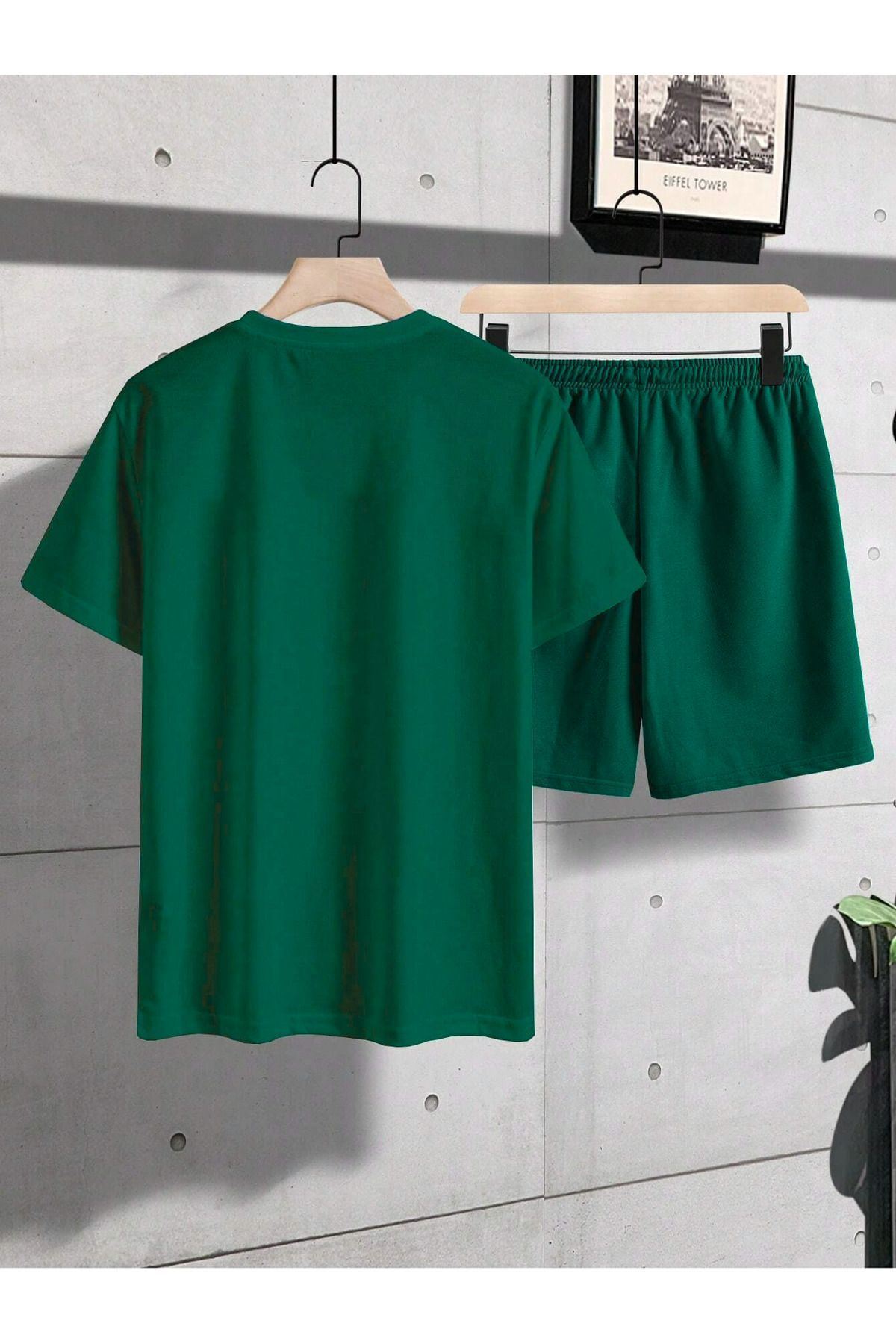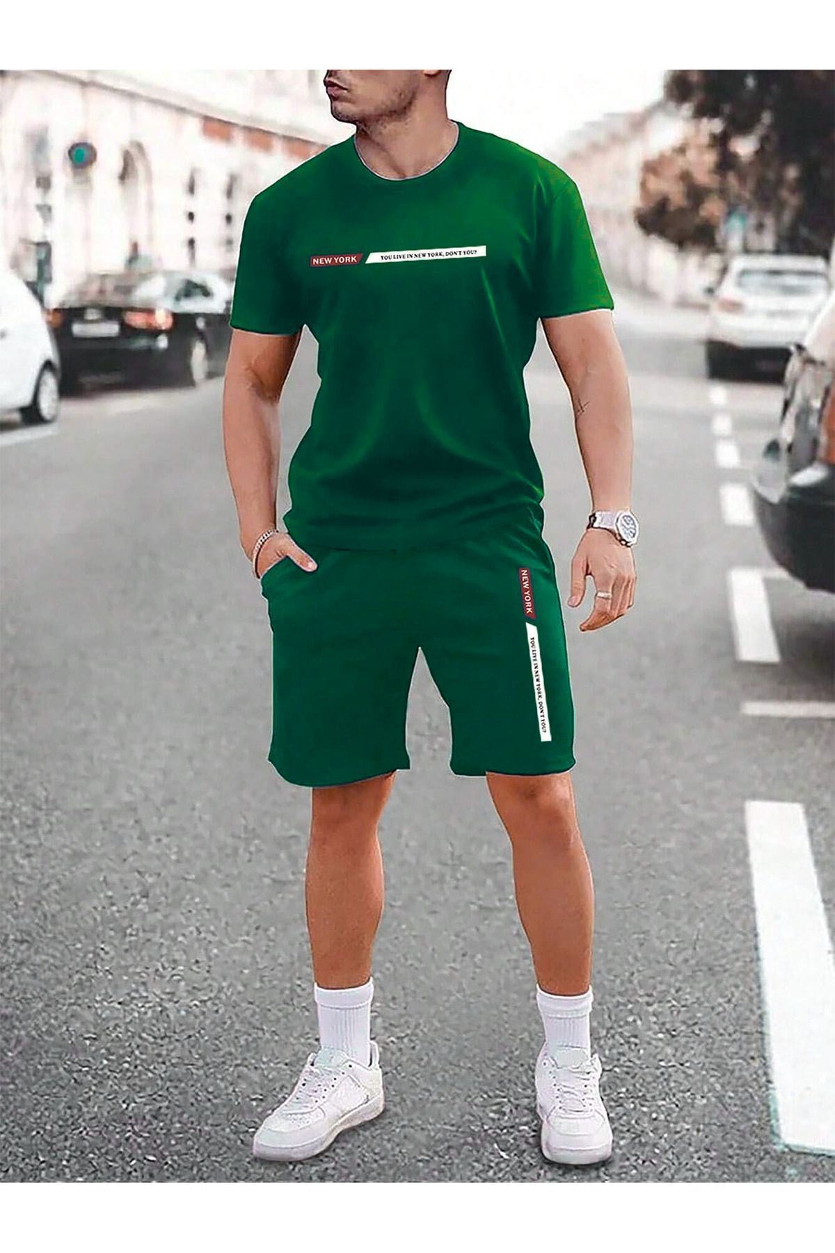 Newyork Çizgi T-Shirt Şort - Yeşil Alt Üst Kombin Şort Tişört Takım Baskılı Oversize Bisiklet Yaka