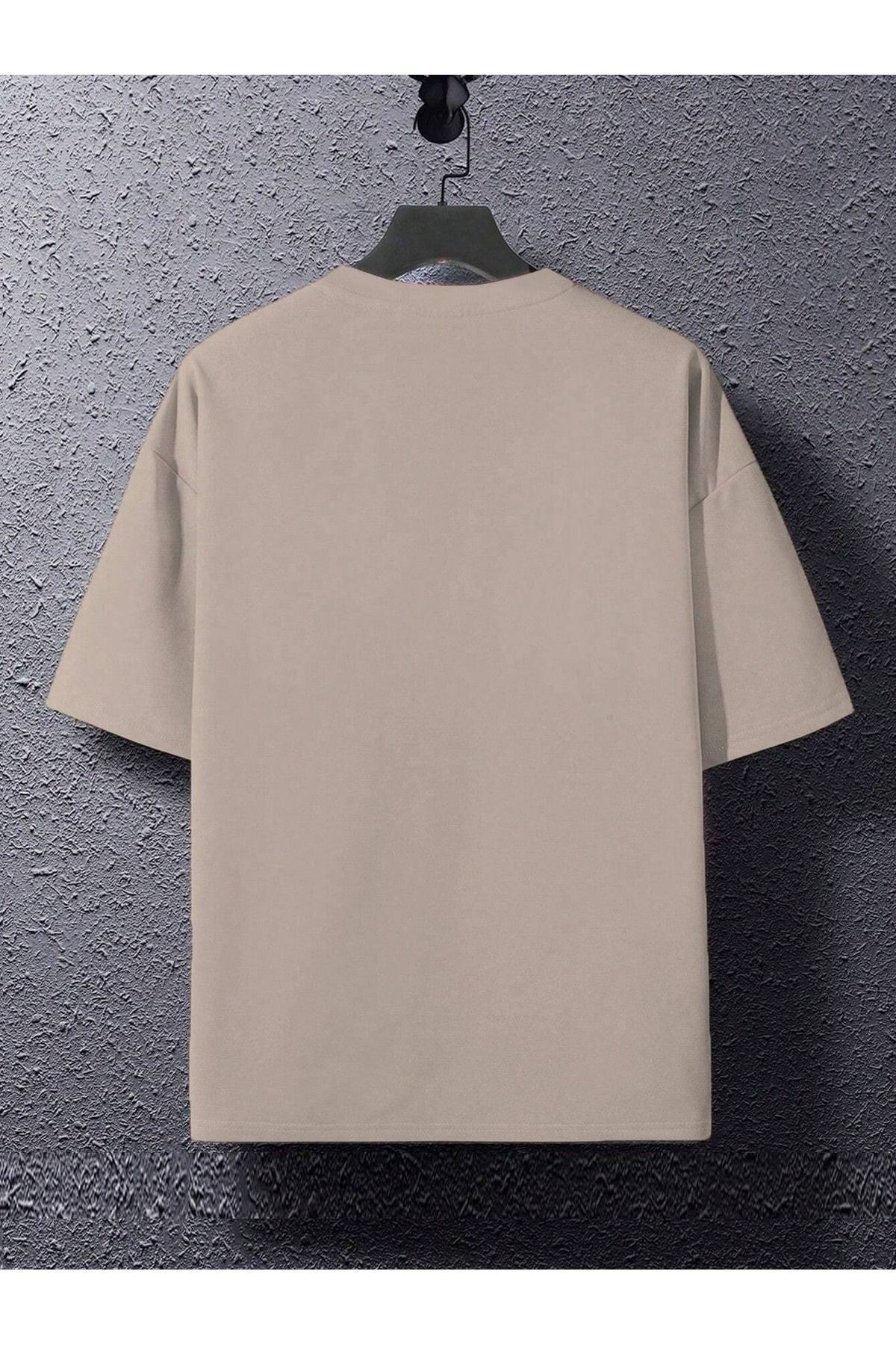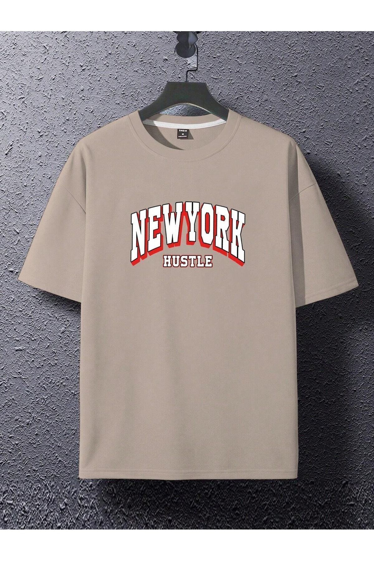 Newyork Hustle Süprem T-Shirt - Bej Baskılı Oversize Bisiklet Yaka Kısa Kol Tişört