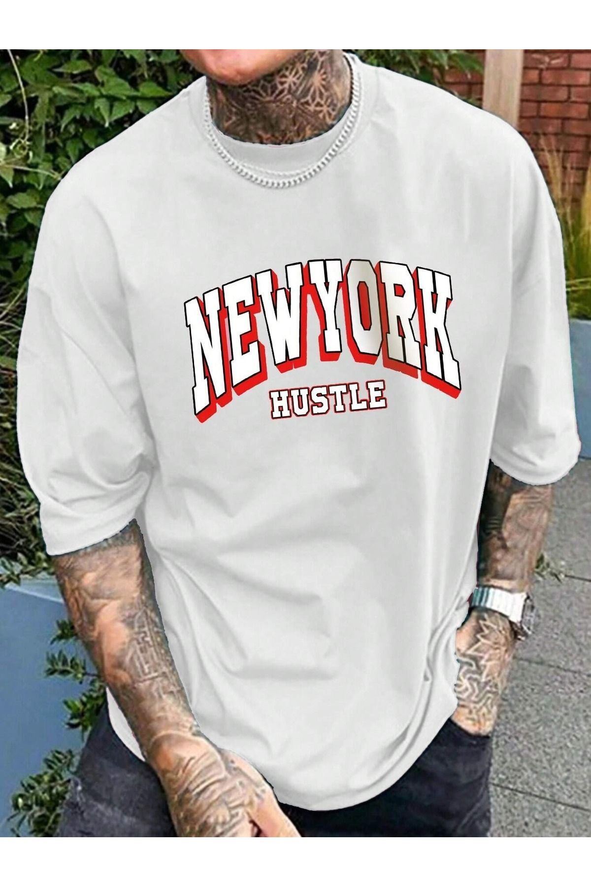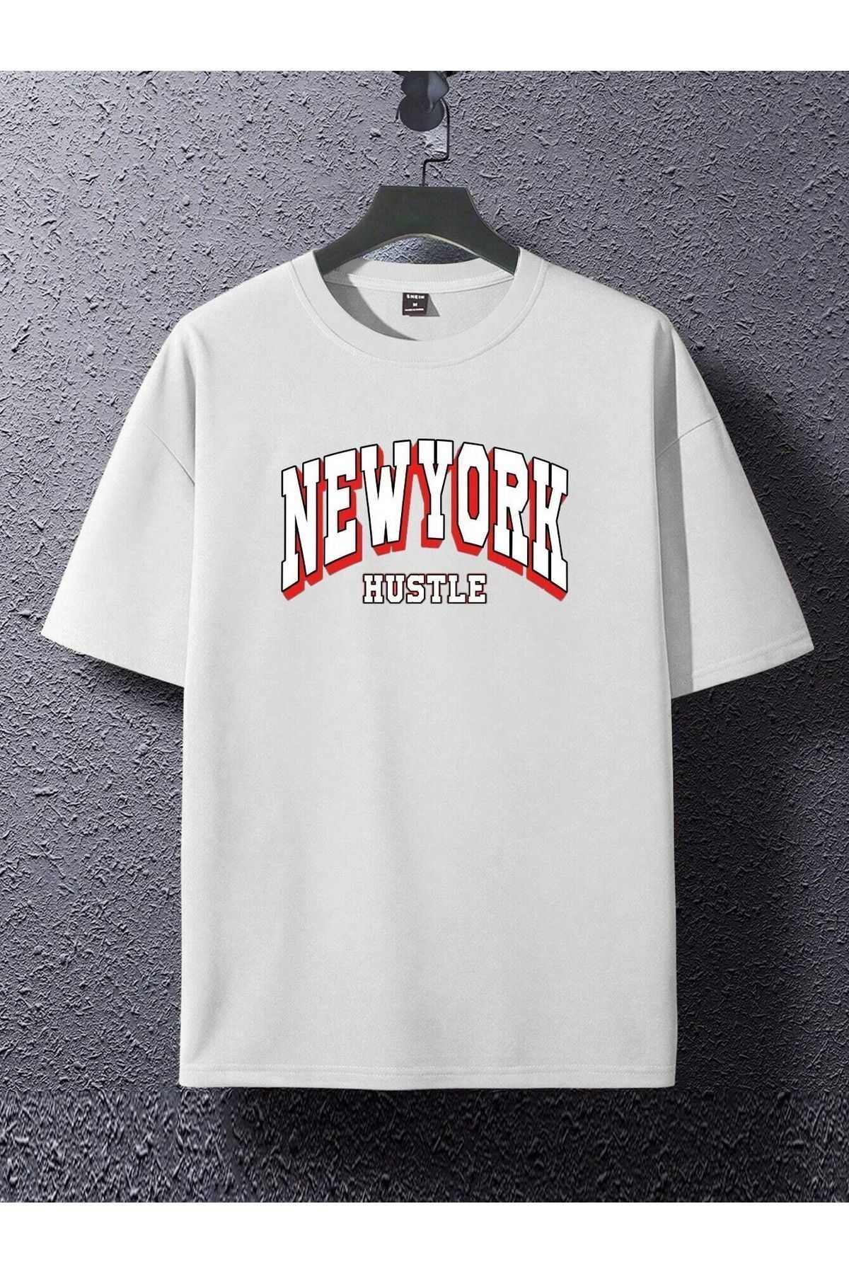 Newyork Hustle Süprem T-Shirt - Beyaz Baskılı Oversize Bisiklet Yaka Kısa Kol Tişört