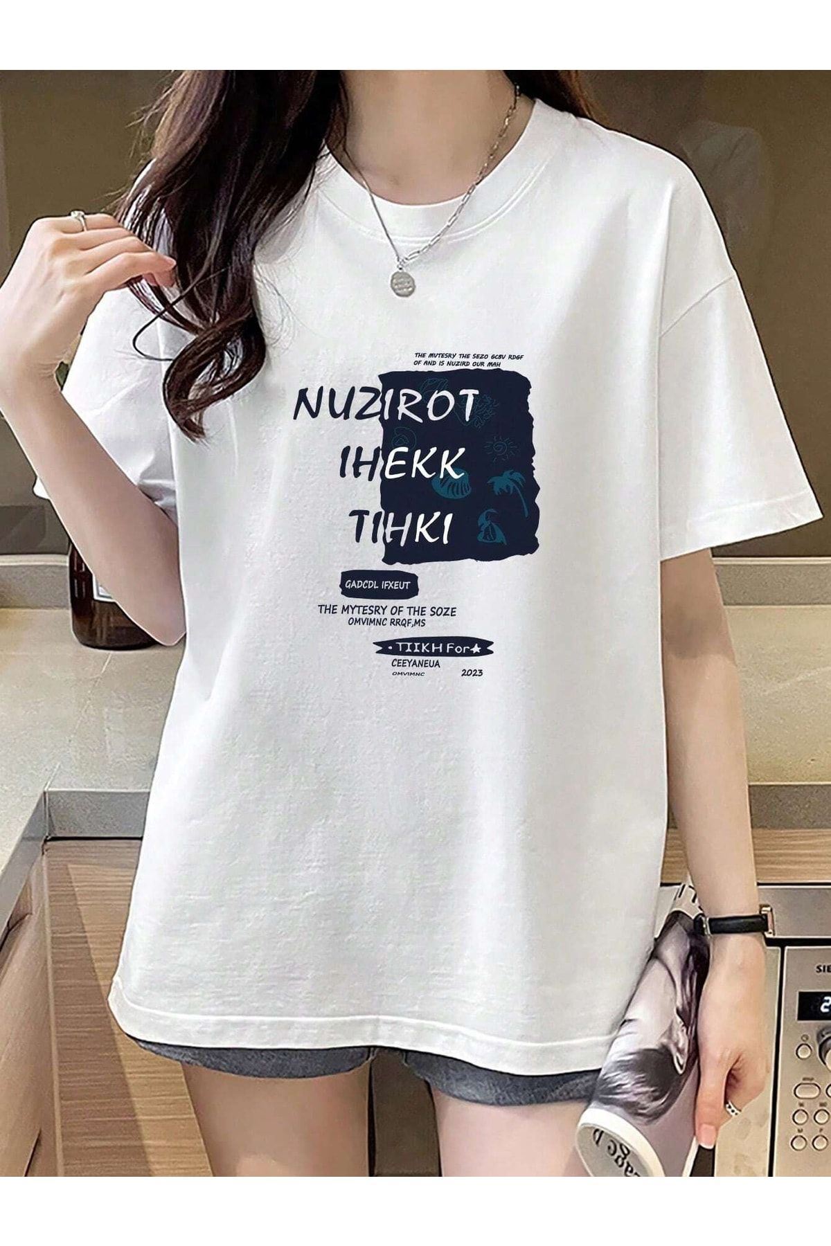 Nuzirot T-shirt - Beyaz Baskılı Oversize Bisiklet Yaka Kısa Kol Tişört