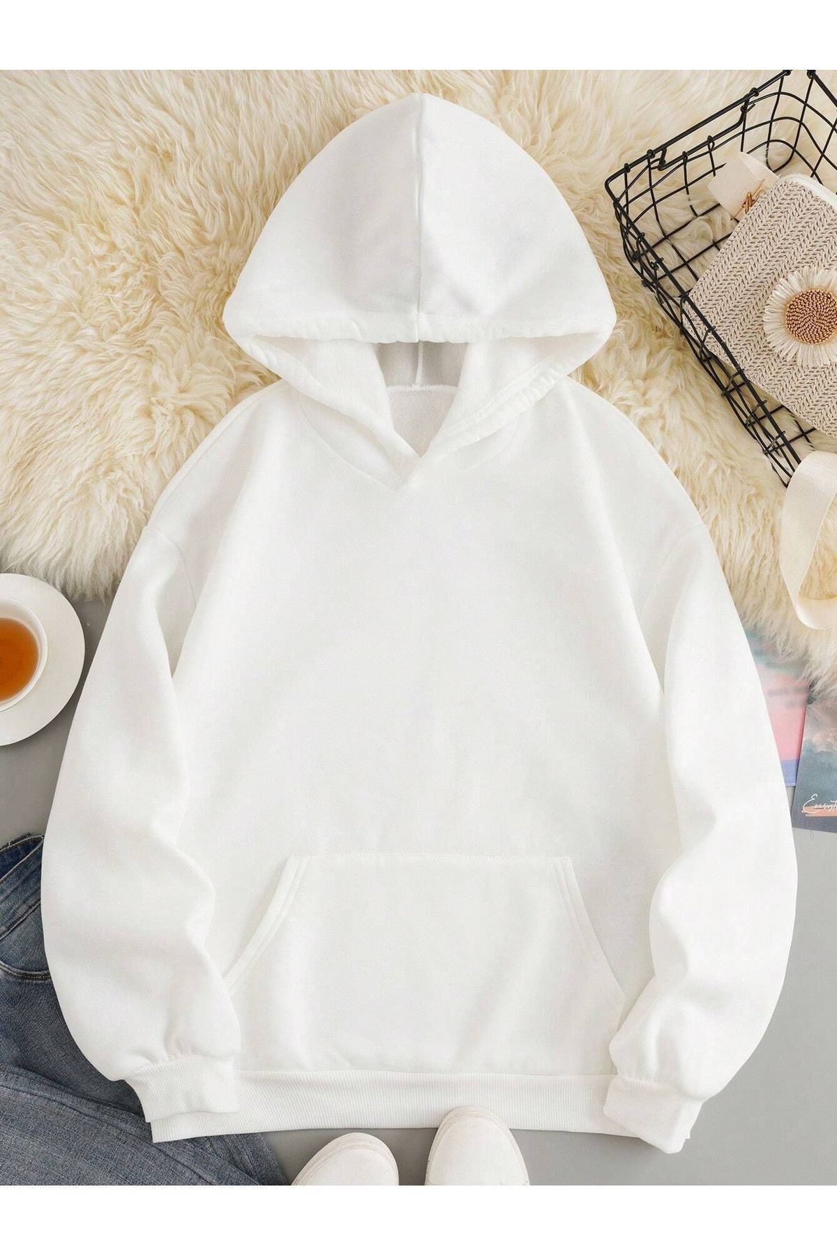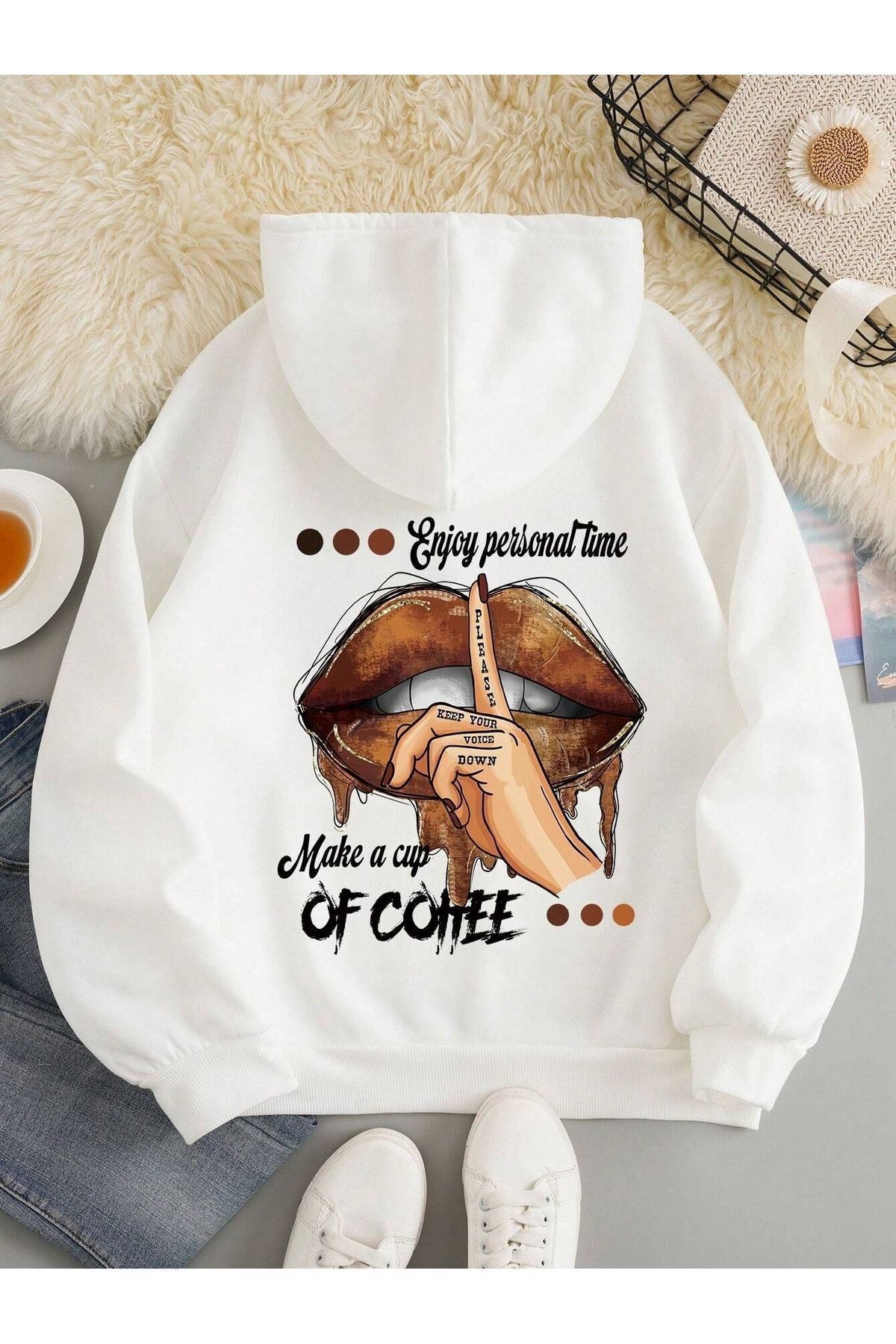 Of Coffee Lips Sweatshirt - Beyaz Baskılı Oversize Kalın Kışlık Kapüşonlu