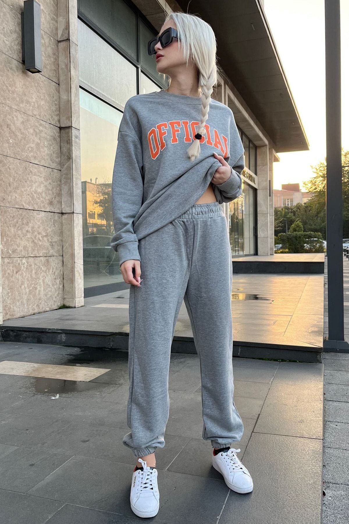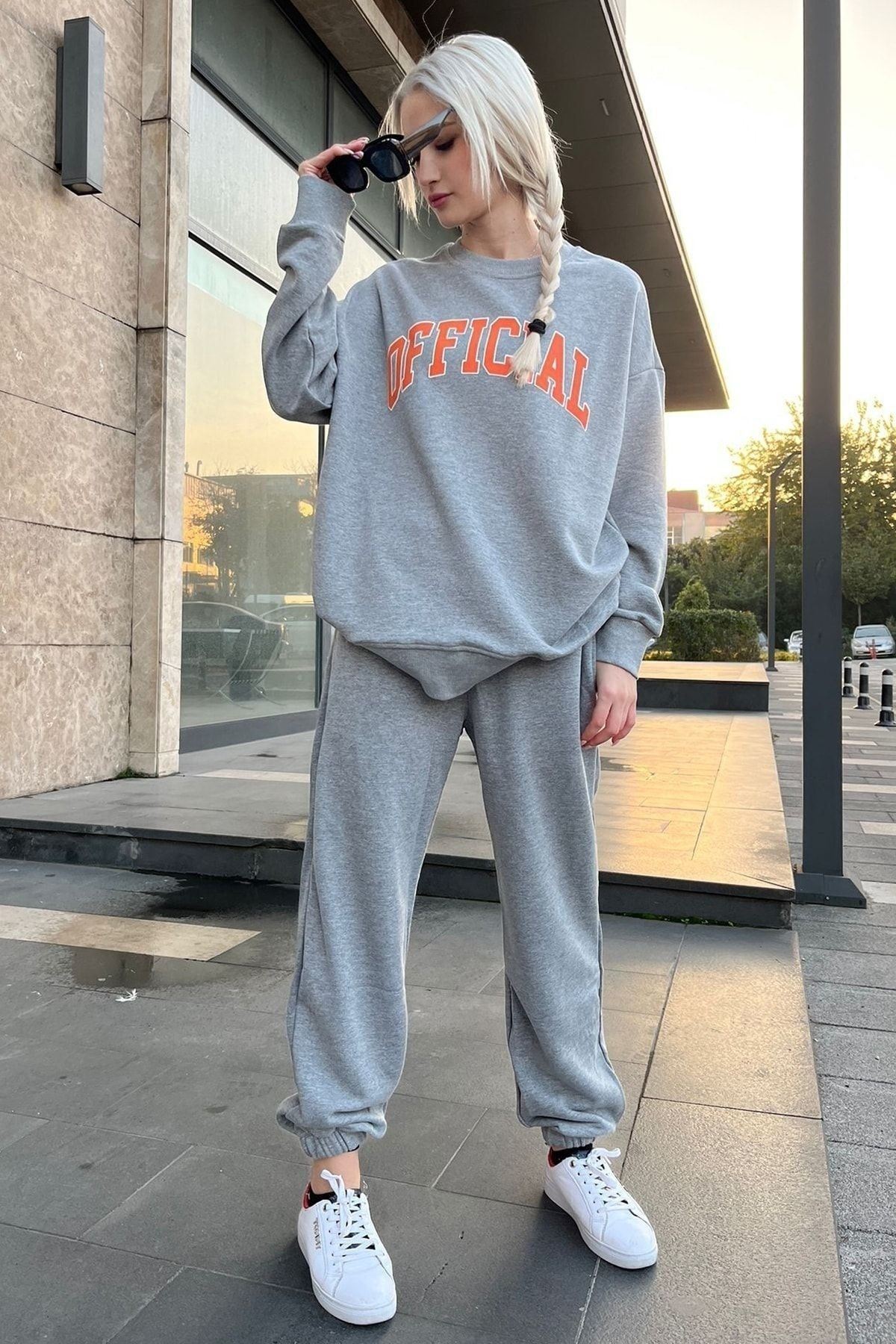 Official Eşofman Takımı Sweatshirt Jogger - Gri Baskılı Oversize Şardonlu Bisiklet Yaka