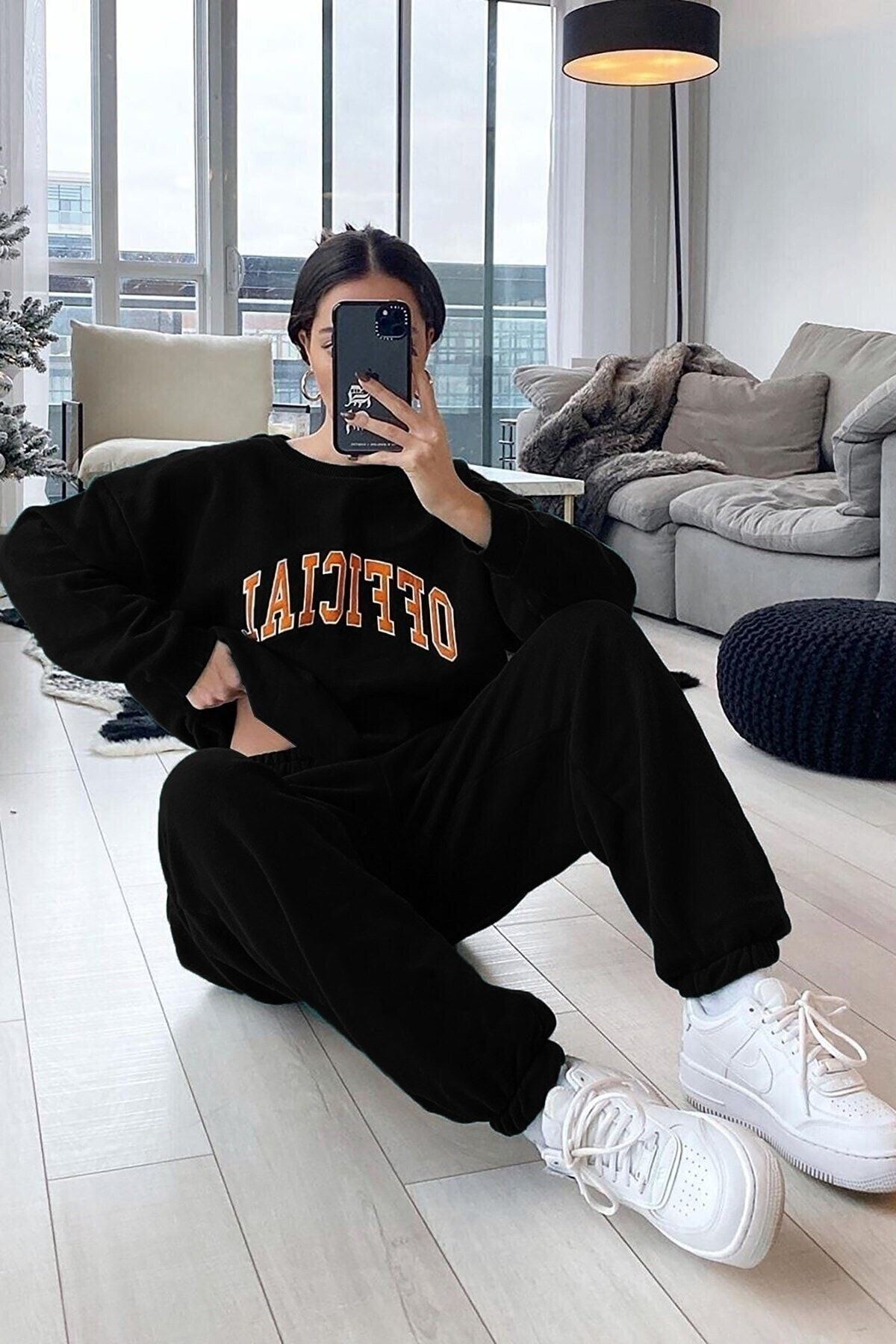 Official Eşofman Takımı Sweatshirt Jogger - Siyah Baskılı Oversize Şardonlu Bisiklet Yaka
