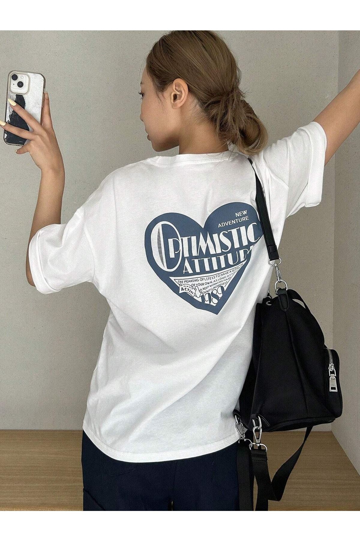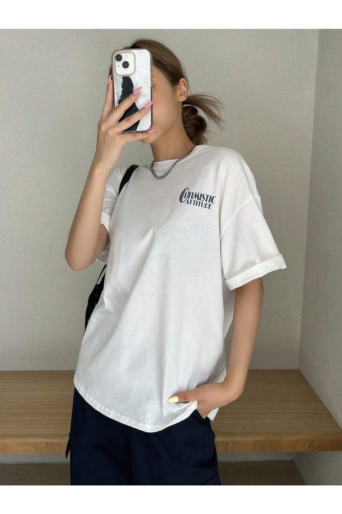 Optimistic Attitude T-shirt - Beyaz Baskılı Oversize Bisiklet Yaka Kısa Kol Tişört