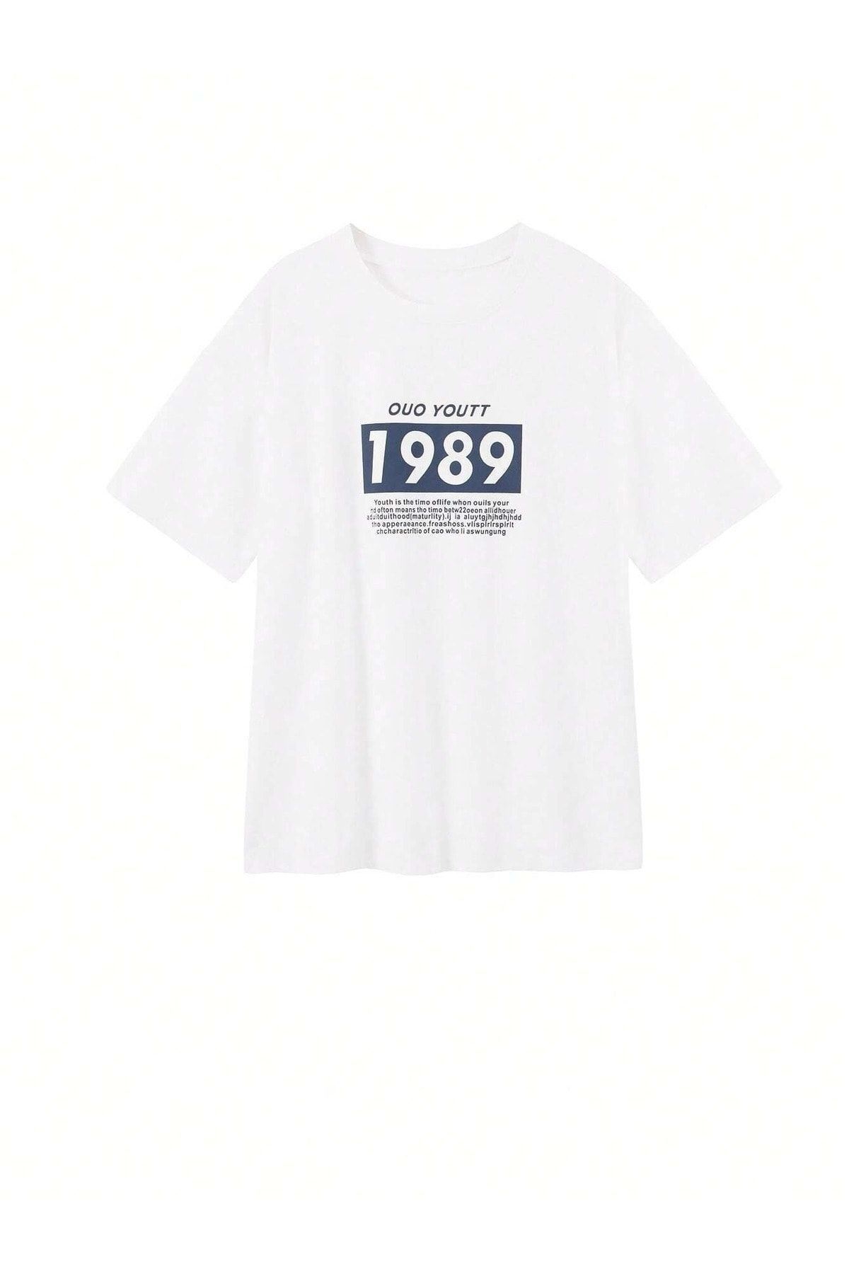 Ouo Youtt 1989 T-Shirt - Beyaz Baskılı Oversize Bisiklet Yaka Kısa Kol