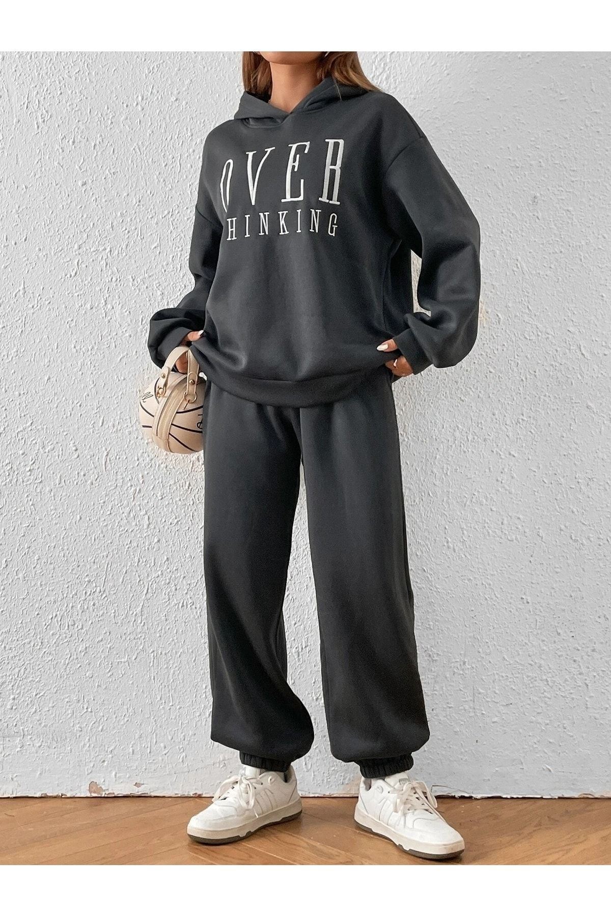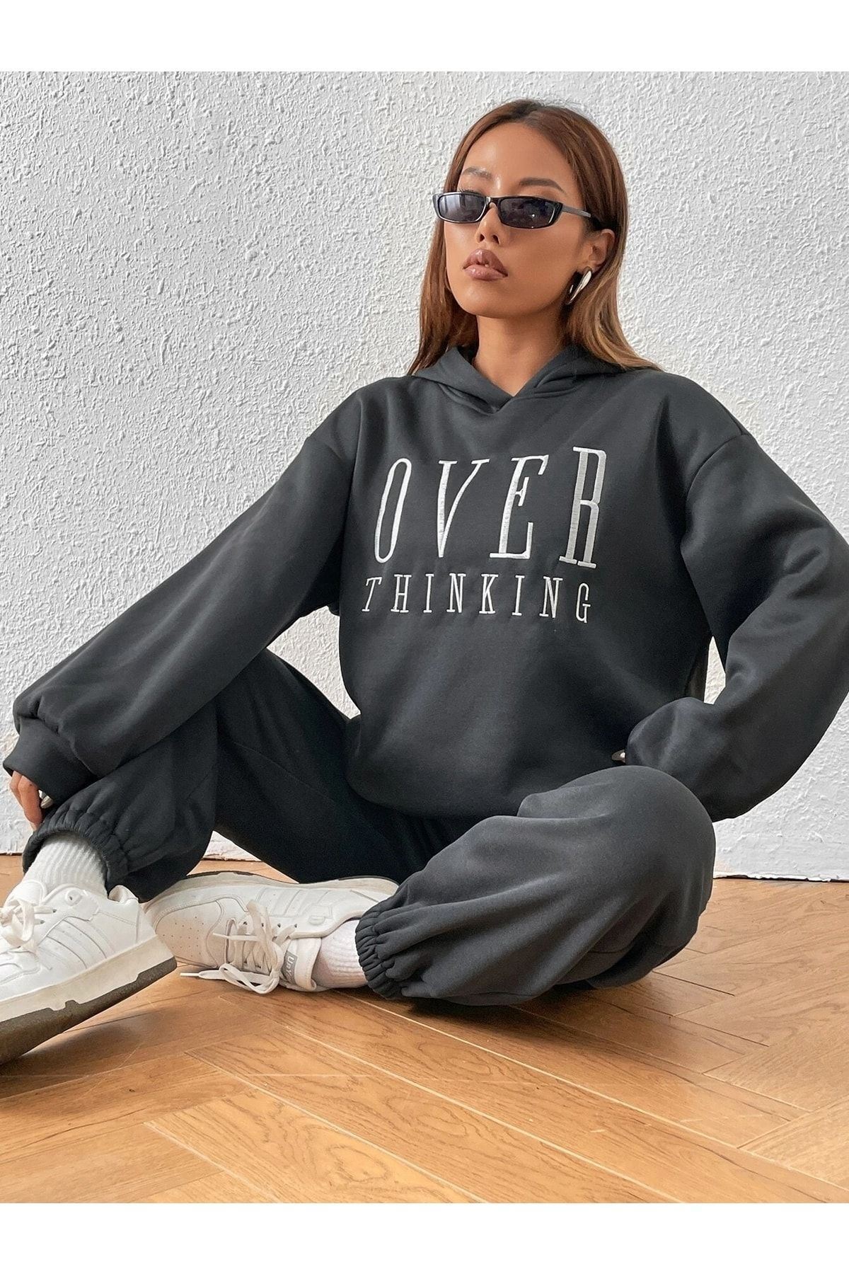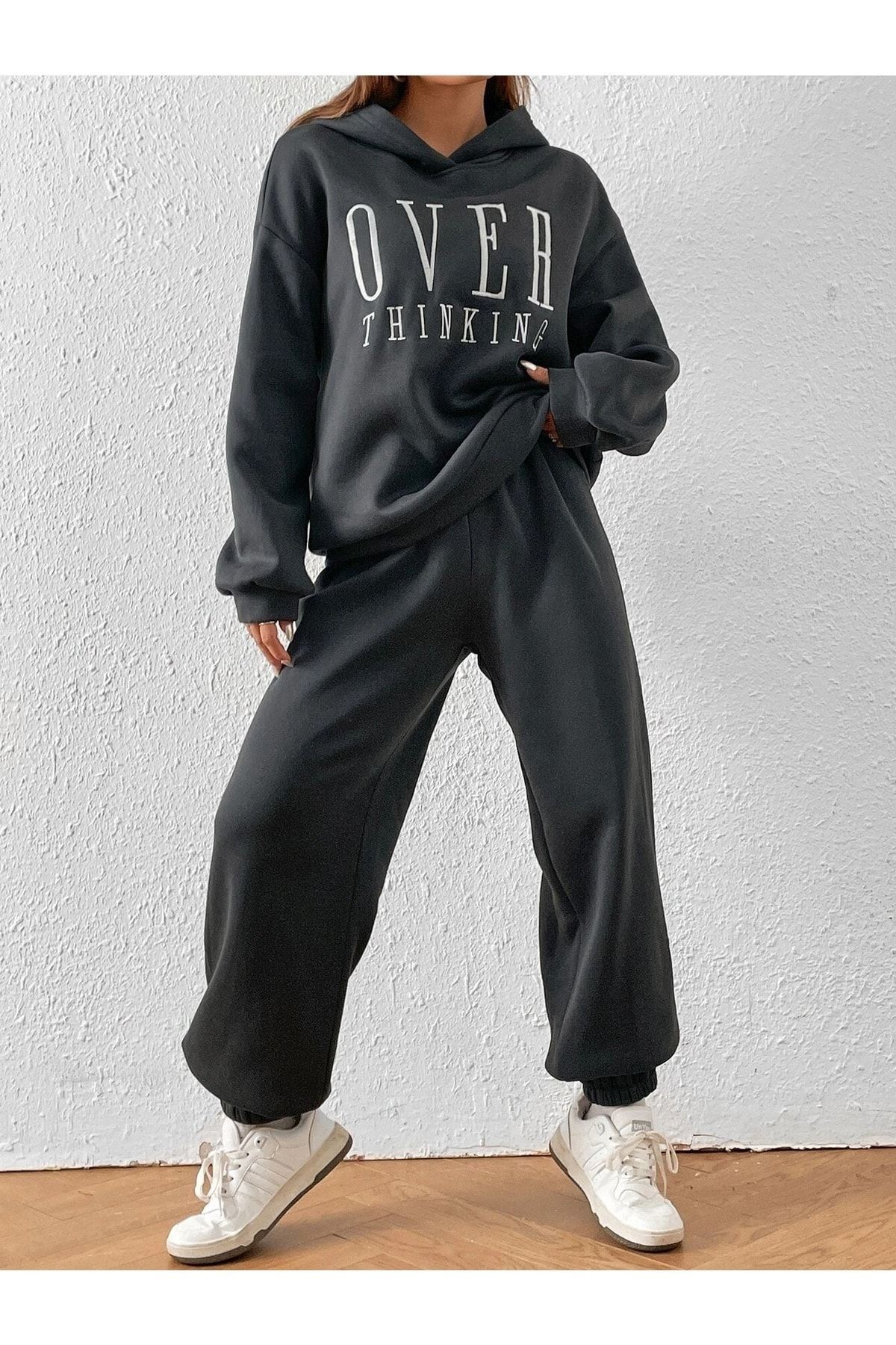 Over Thinking Eşofman Takımı Sweatshirt Jogger -füme Baskılı Oversize Şardonlu Kapüşonlu Lastik Paç