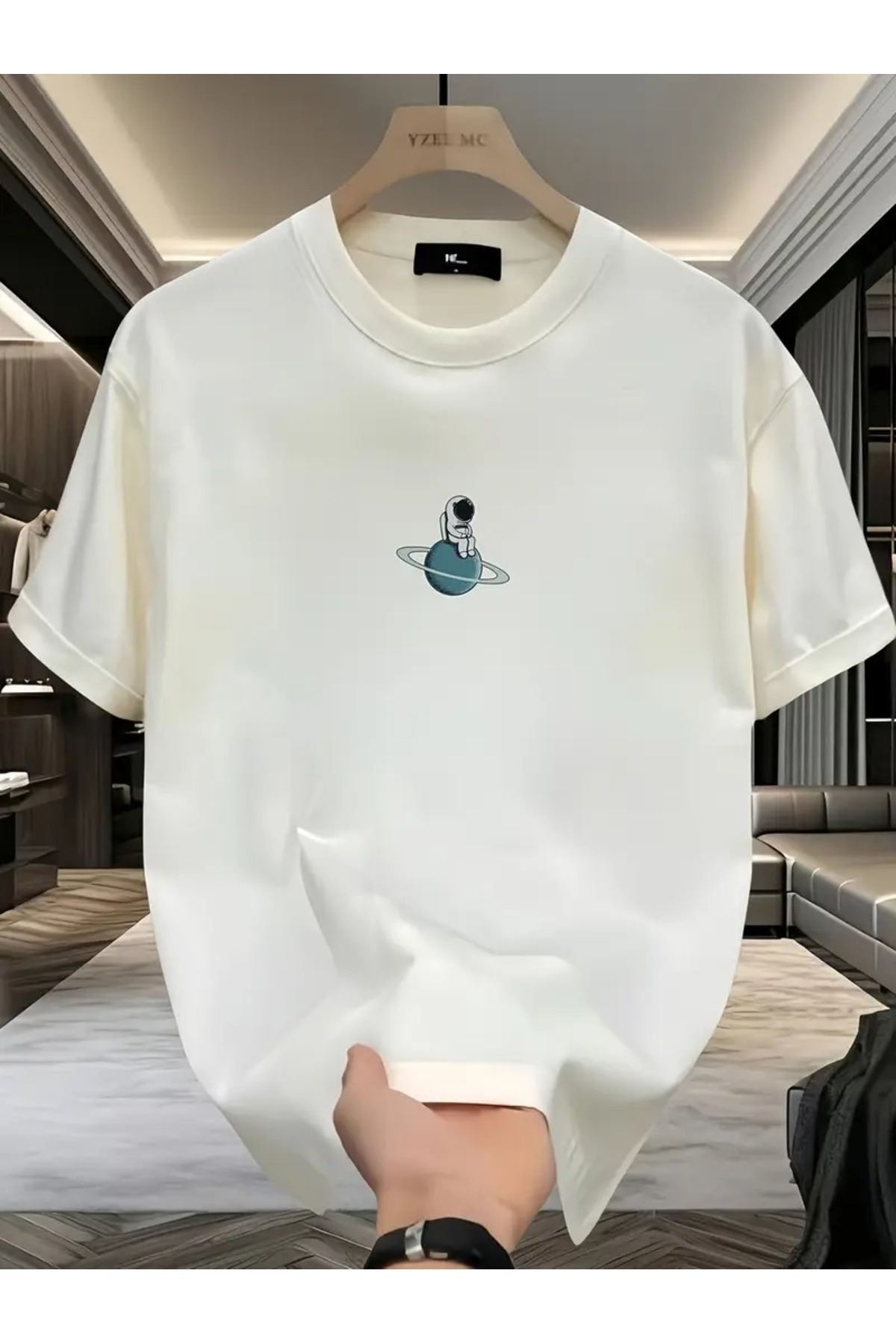 Oversize Beyaz Uzay Temalı Tişört – Astronot & Güneş Sistemi Desenli