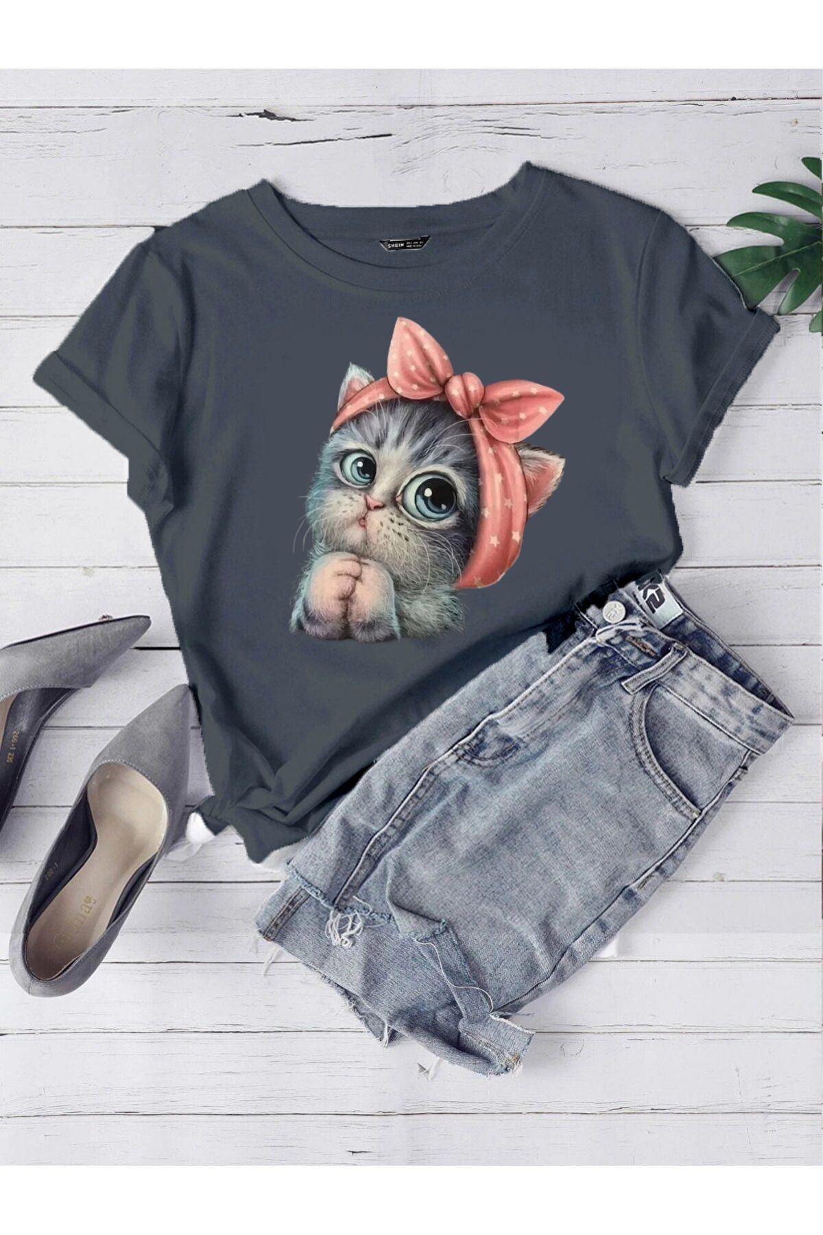 Oversize Füme Sevimli Minik Kedi Baskılı T-shirt Unisex Rahat Kalıp