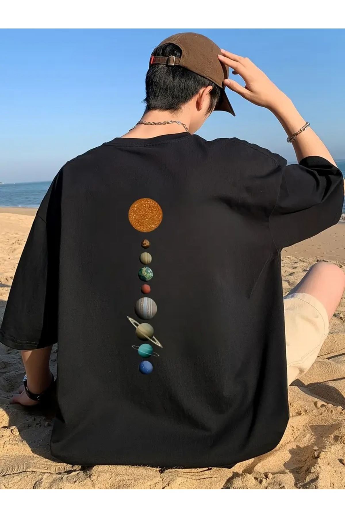 Oversize Siyah Uzay Temalı Tişört – Astronot & Güneş Sistemi Desenli