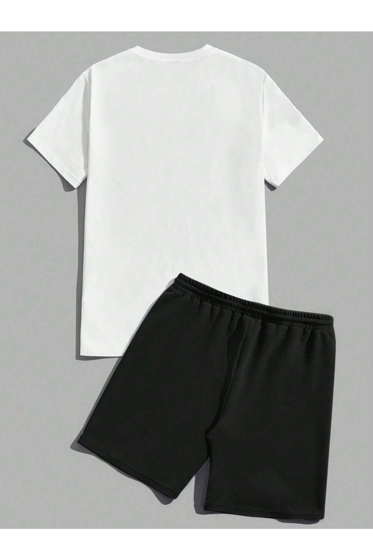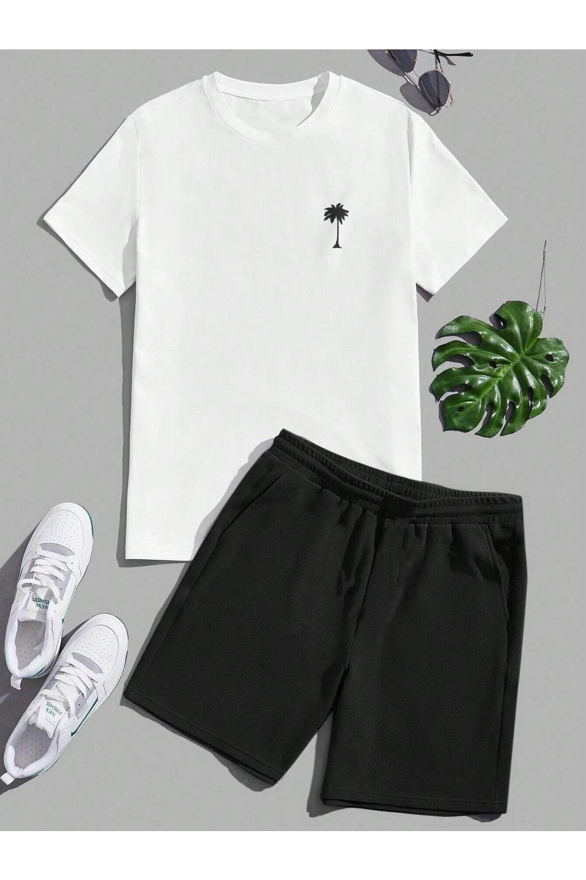 Palmiye Minimal T-shirt Şort - Beyaz Siyah Alt Üst Takım Şort Tişört Kombin Baskılı Bisiklet Yaka