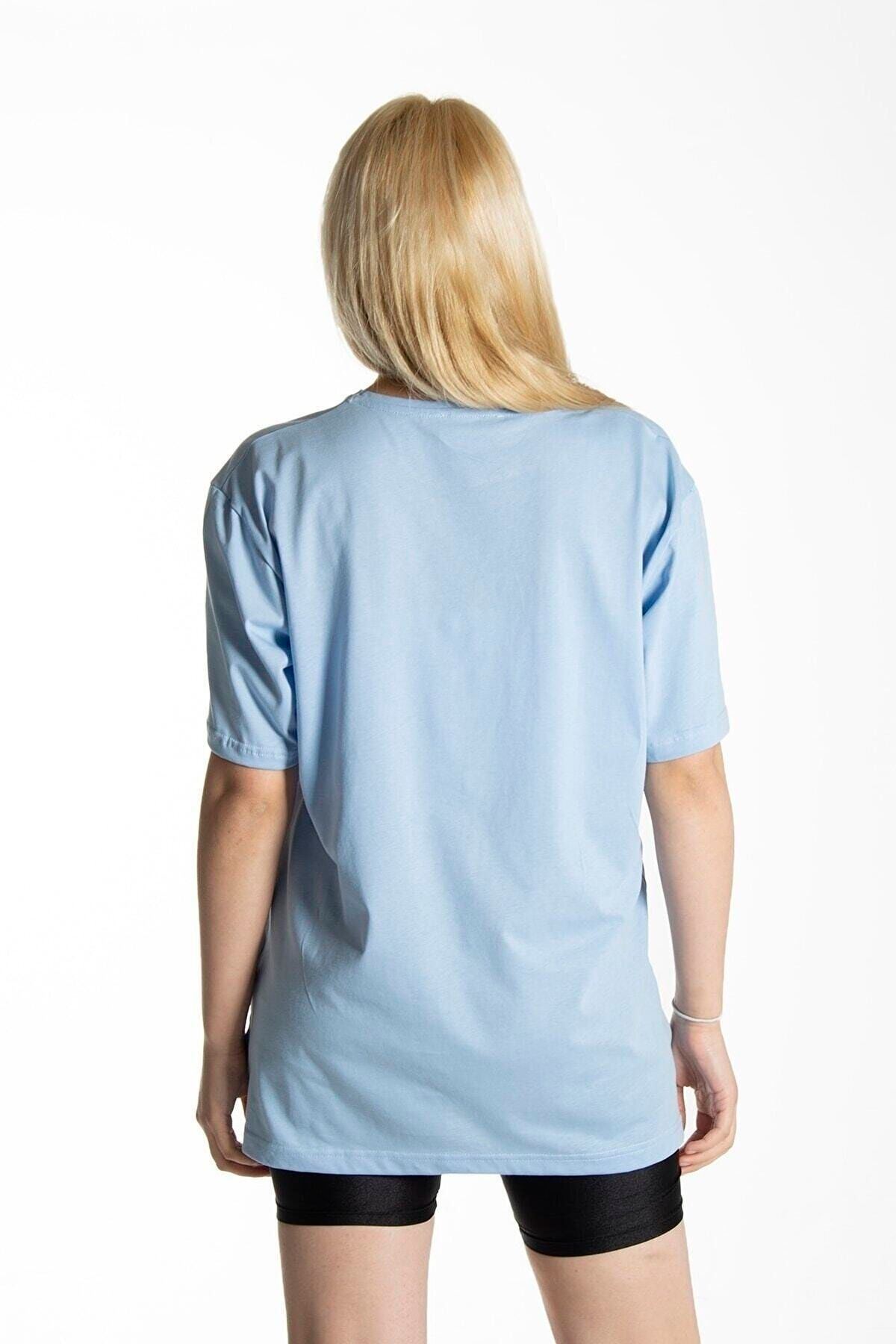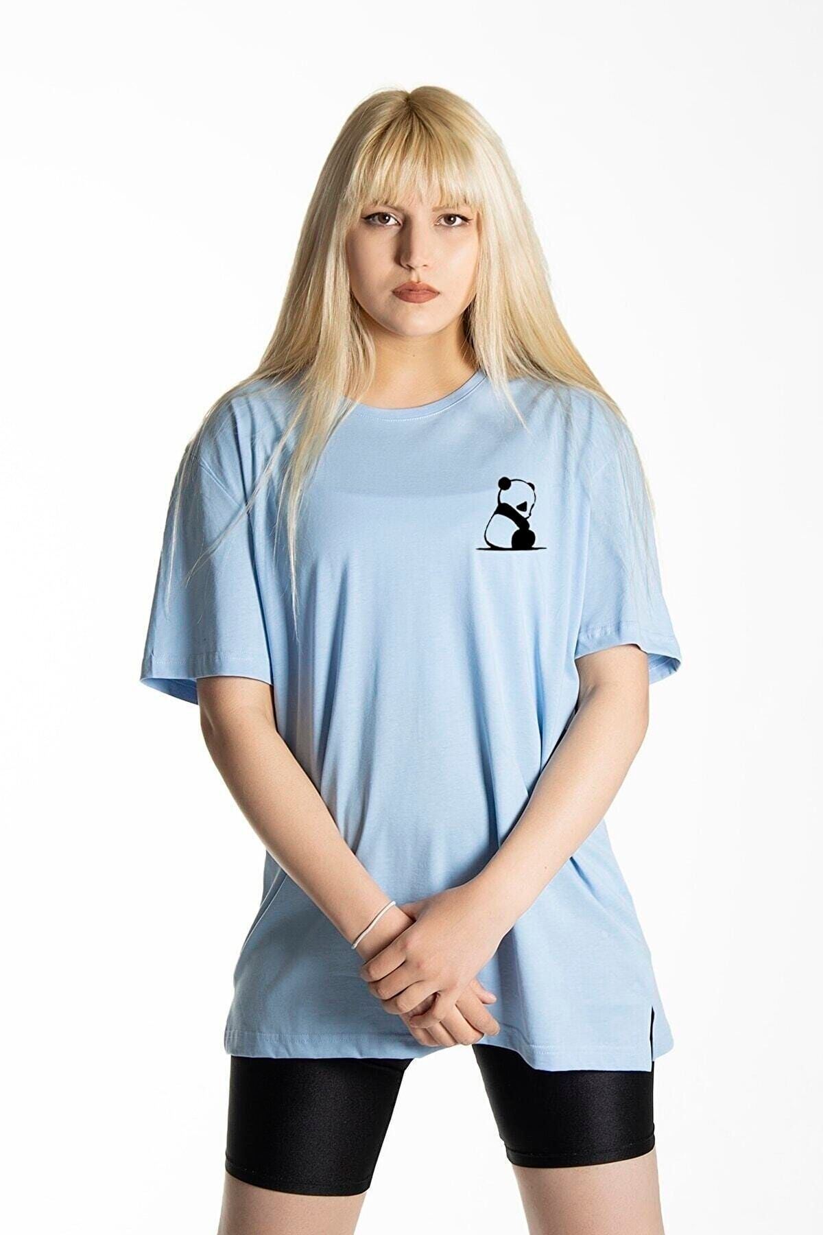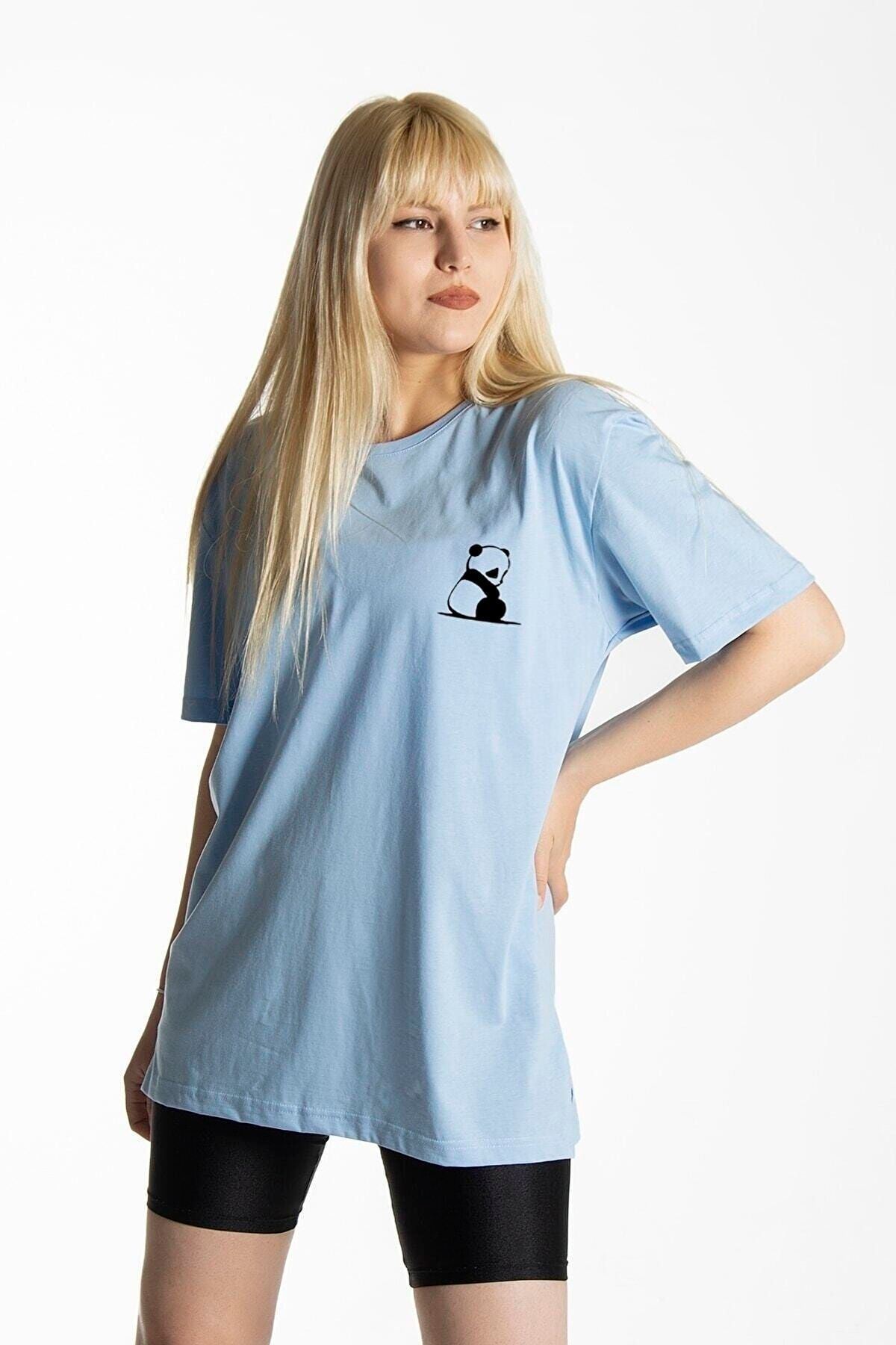 Panda T-shirt - Açık Mavi Baskılı Oversize Bisiklet Yaka Kısa Kol Tişört