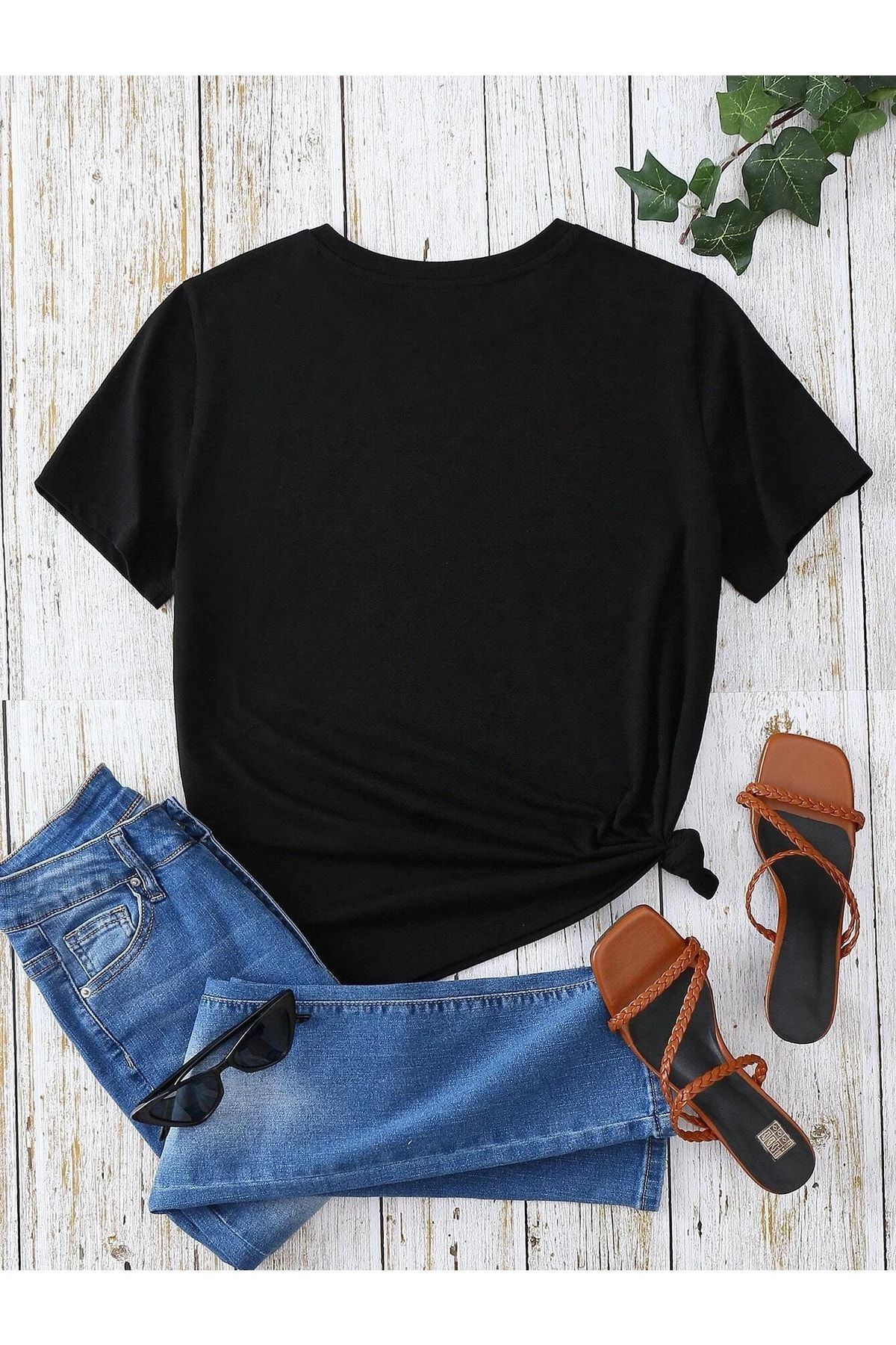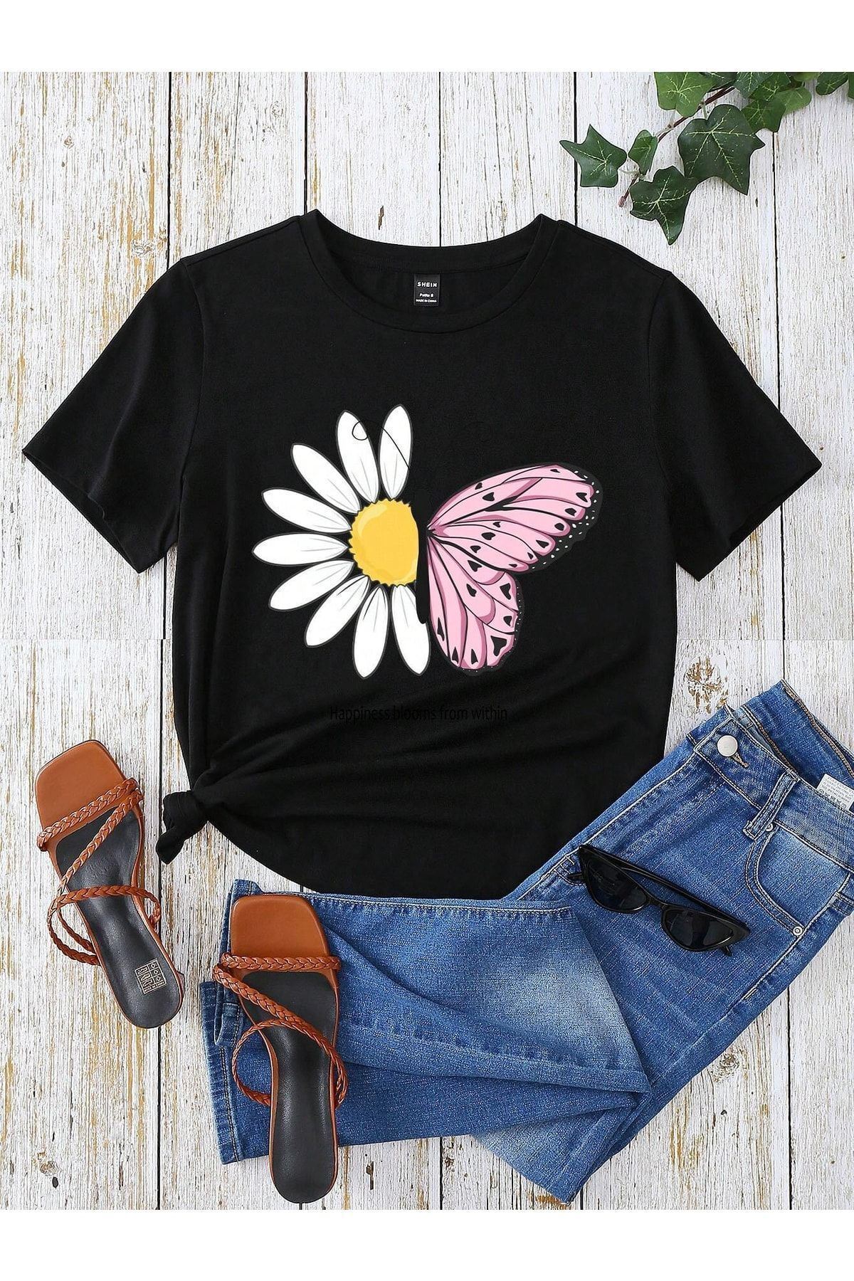 Papatya Kelebek T-shirt - Siyah Baskılı Oversize Bisiklet Yaka Kısa Kol Tişört