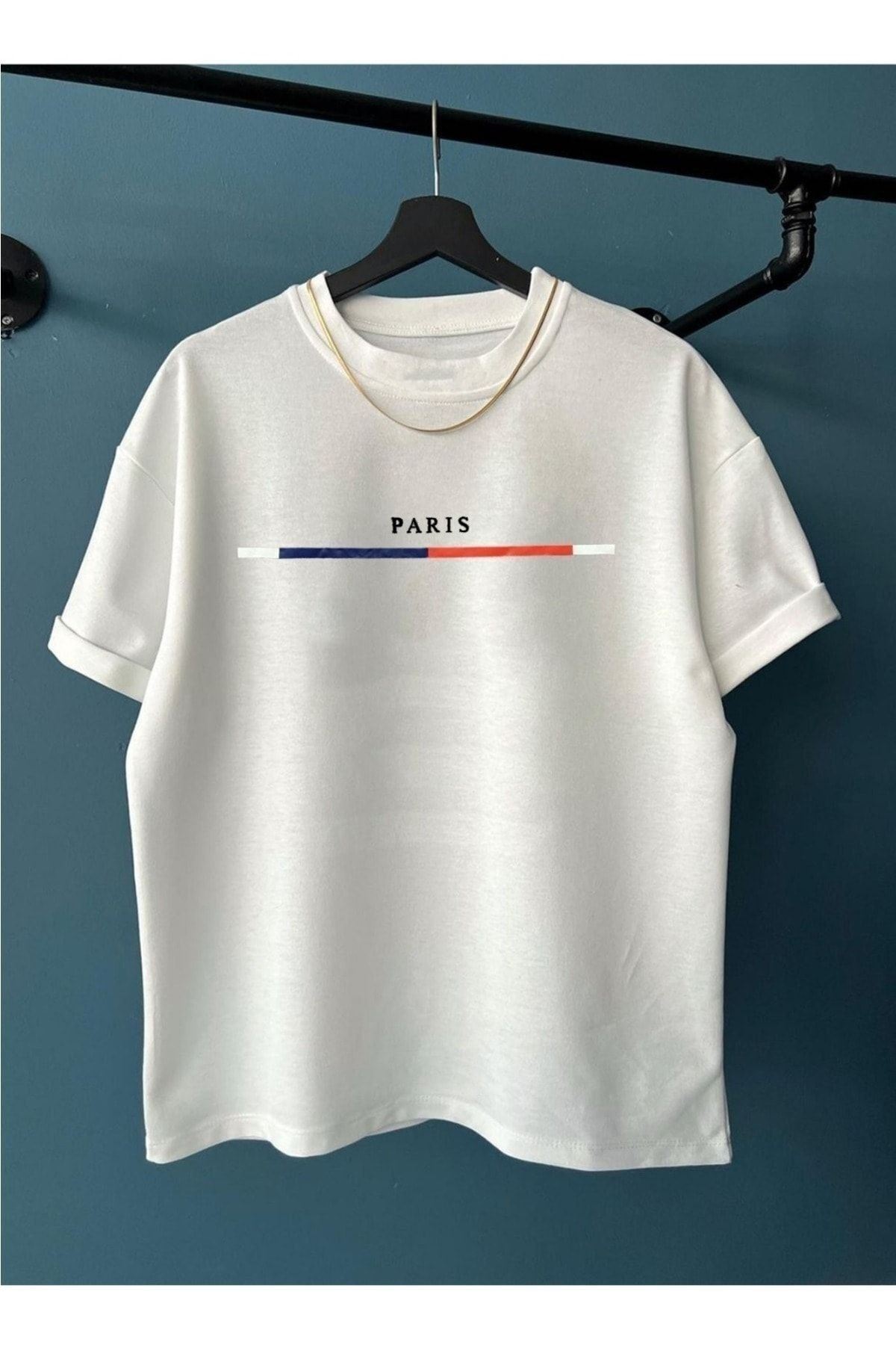Paris Çizgi Detay T-Shirt - Beyaz Baskılı Oversize Bisiklet Yaka Kısa Kol