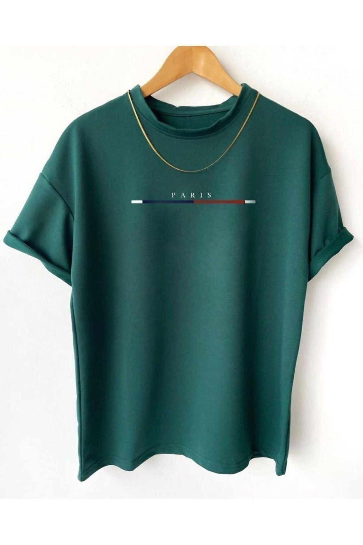 Paris Çizgi Detay T-Shirt - Yeşil Baskılı Oversize Bisiklet Yaka Kısa Kol