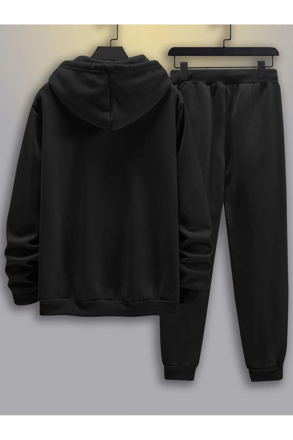 Paris Çizgi Eşofman Takımı Sweatshirt Jogger - Siyah Baskılı Oversize Şardonlu Kapüşonlu