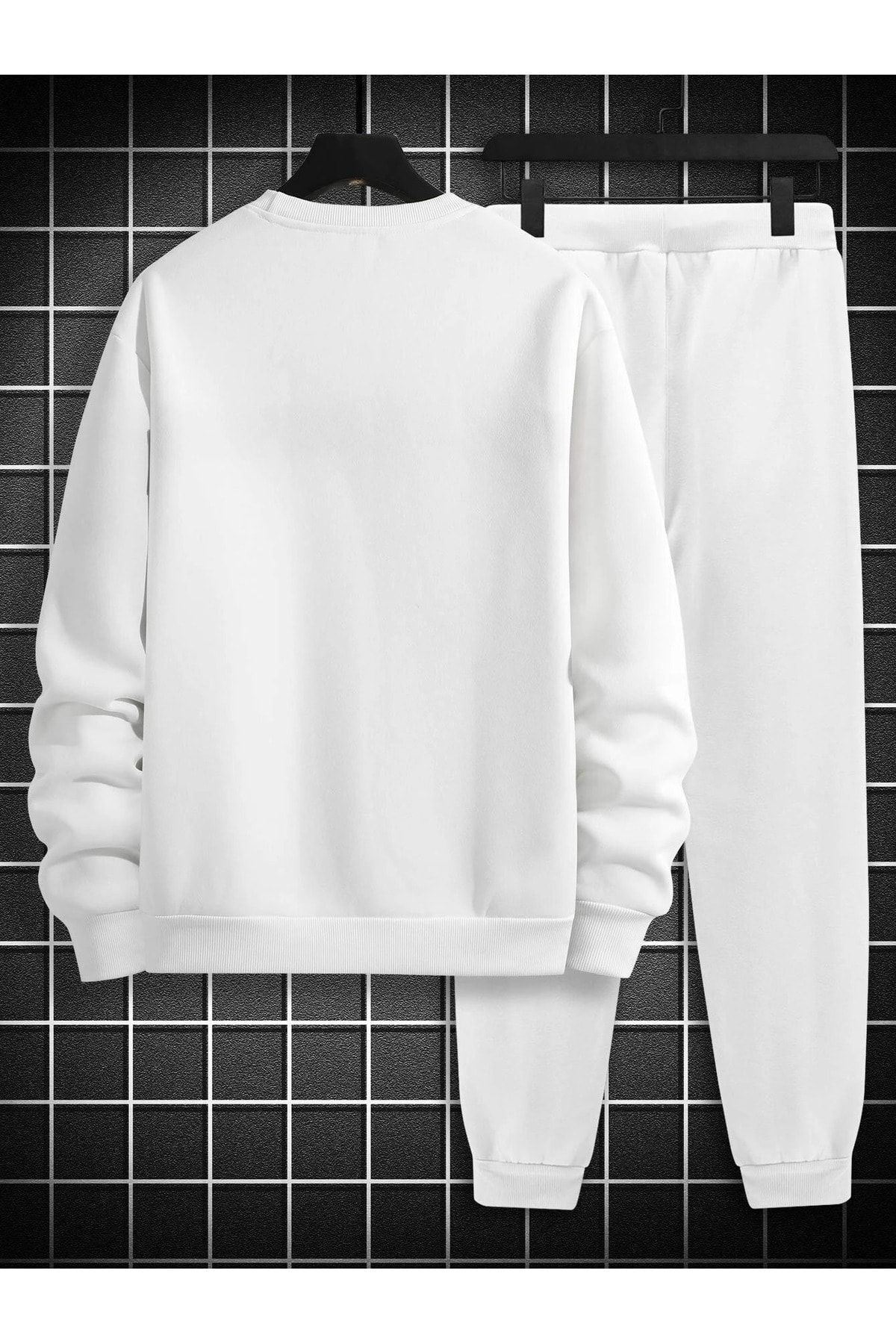 Paris Çizgili Eşofman Takımı Sweatshirt Jogger - Beyaz Baskılı Oversize Şardonlu Bisiklet Yaka