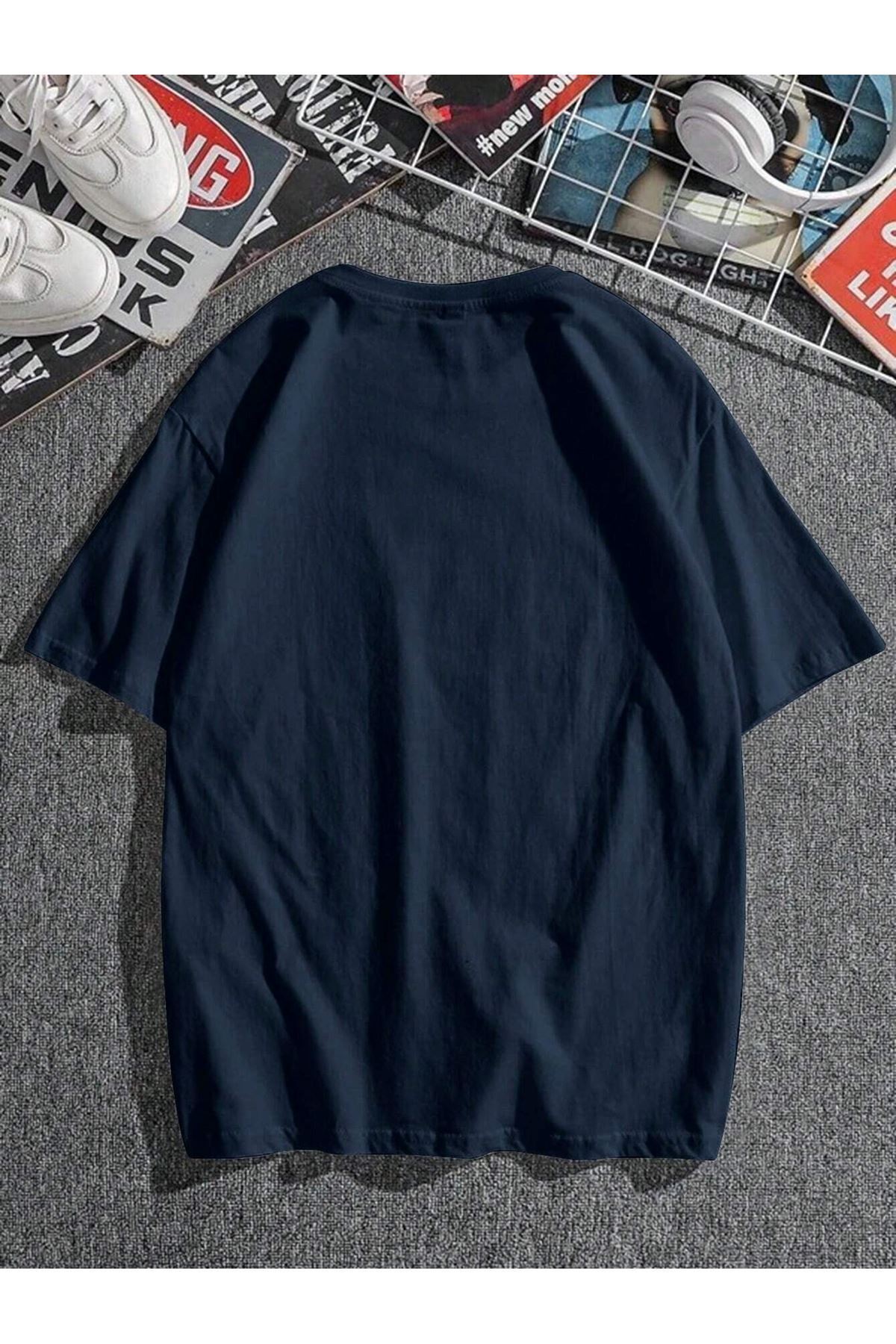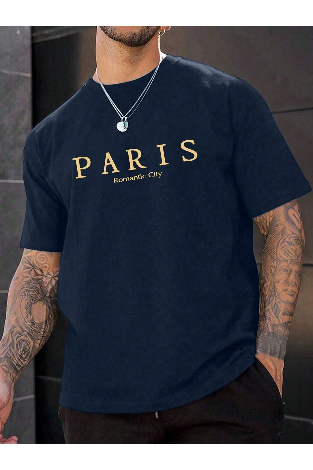 Paris Romantic City Baskılı Süprem Lacviert T-Shirt - Oversize Bisiklet Yaka Tişört